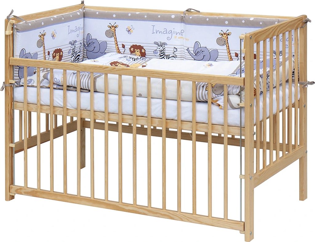 - Dřevěná postýlka 120×60 cm – masiv borovice, stahovací bok, 6 poloh roštu