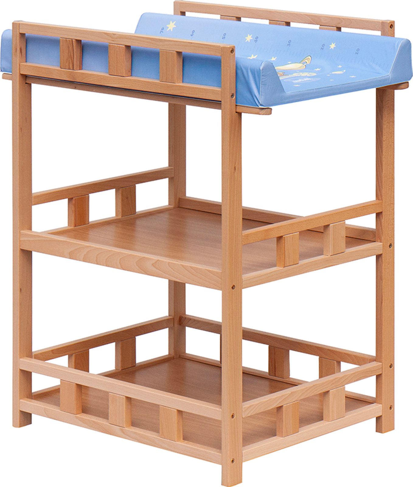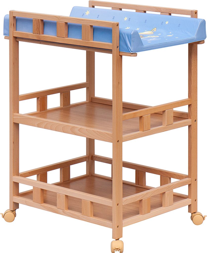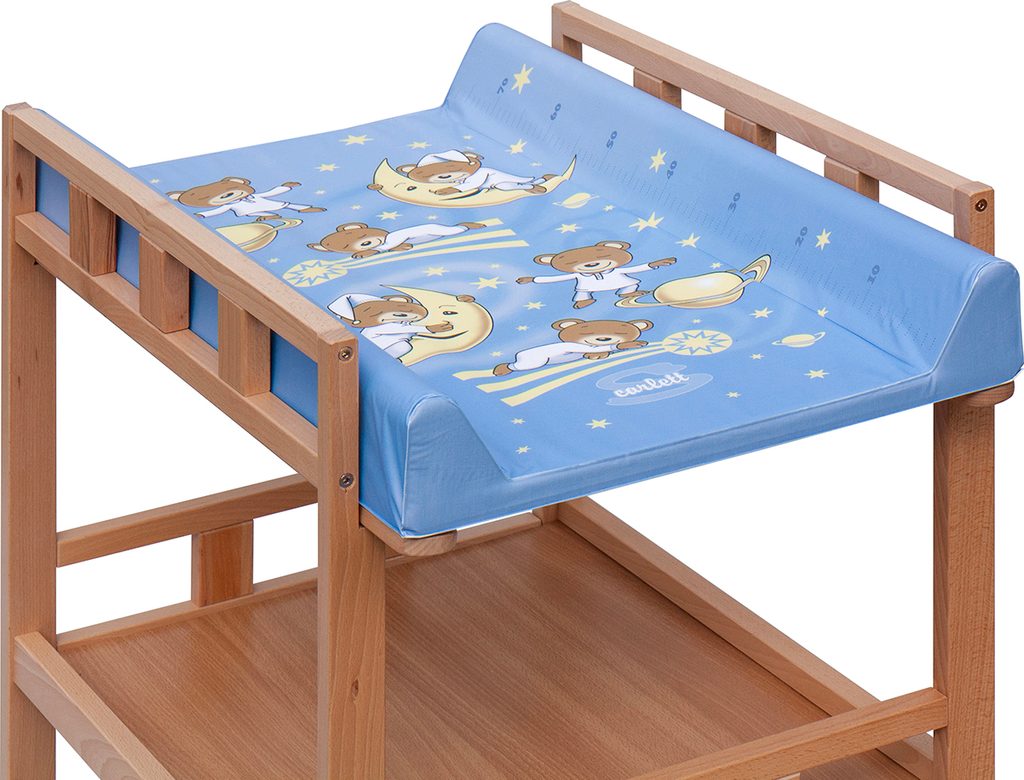 Praktický přebalovací pult se dvěmi policemi z HDF desky. Vrchní přebalovací pult z polyuretanu potažený omyvatelným PVC, vyztužený MDF deskou.