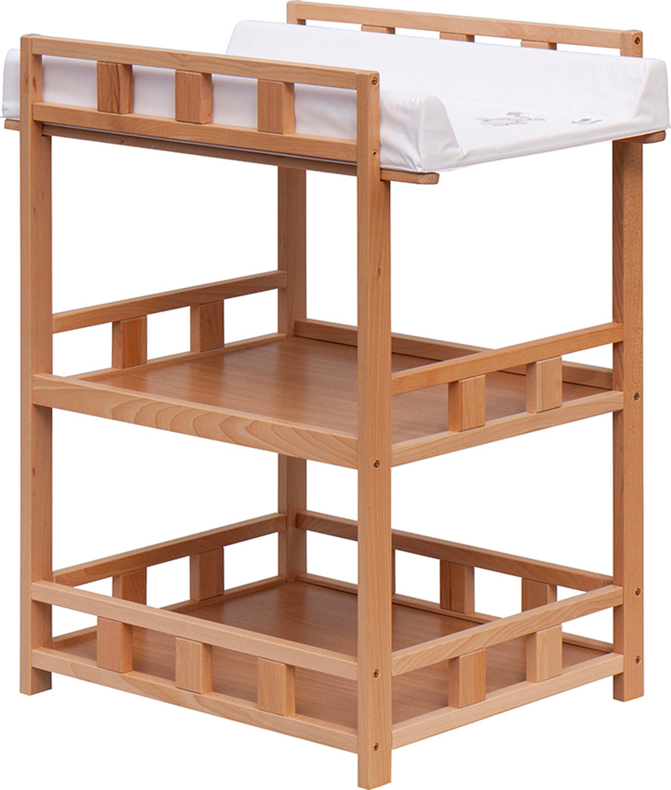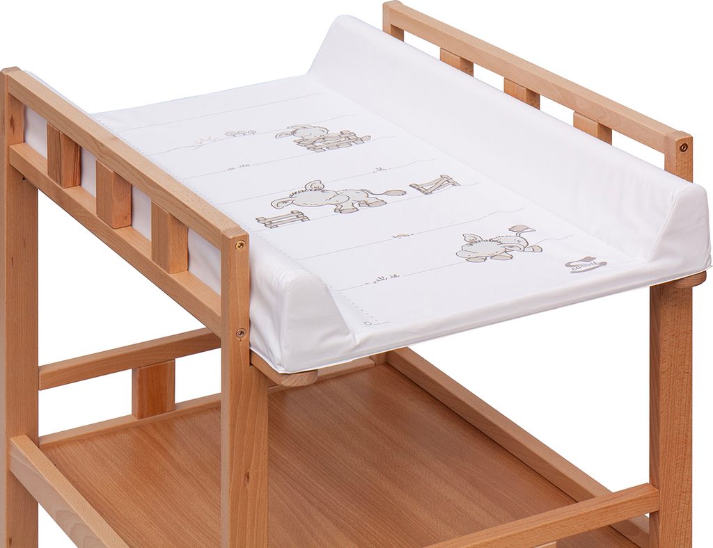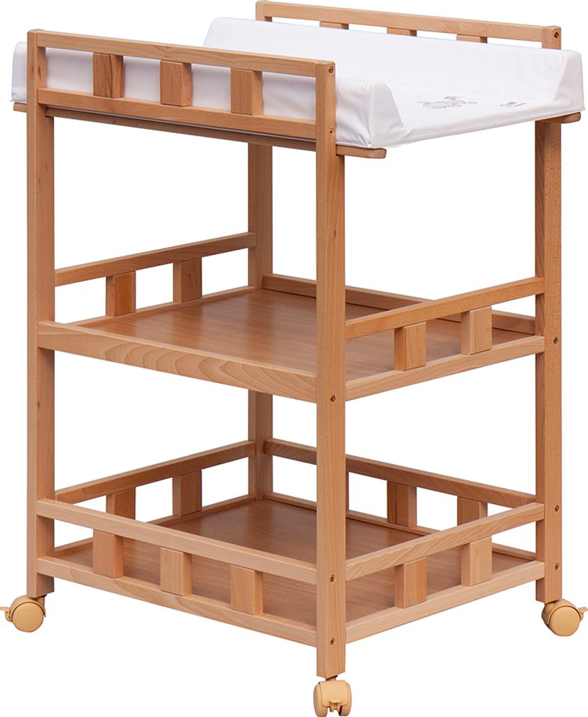 Praktický přebalovací pult se dvěmi policemi z HDF desky. Vrchní přebalovací pult z polyuretanu potažený omyvatelným PVC, vyztužený MDF deskou.
