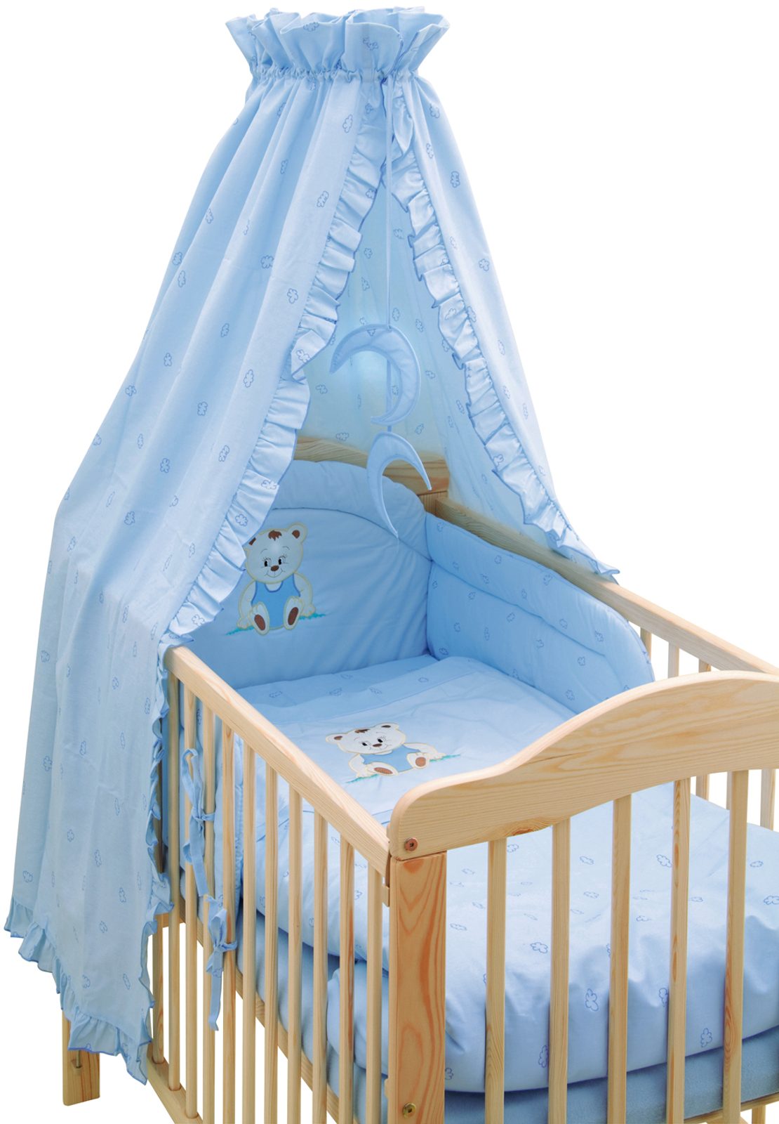 Souprava obsahuje: povlečení na peřinku 100 x 135 cm, povlečení na polštář 60 x 40 cm, mantinel do postýlky (okolo 2/3 postýlky) a nebesa. Tato souprava je vhodná i do postýlek 140 x 70cm.