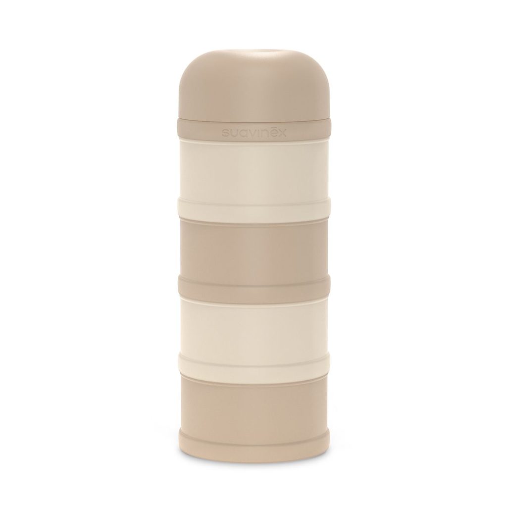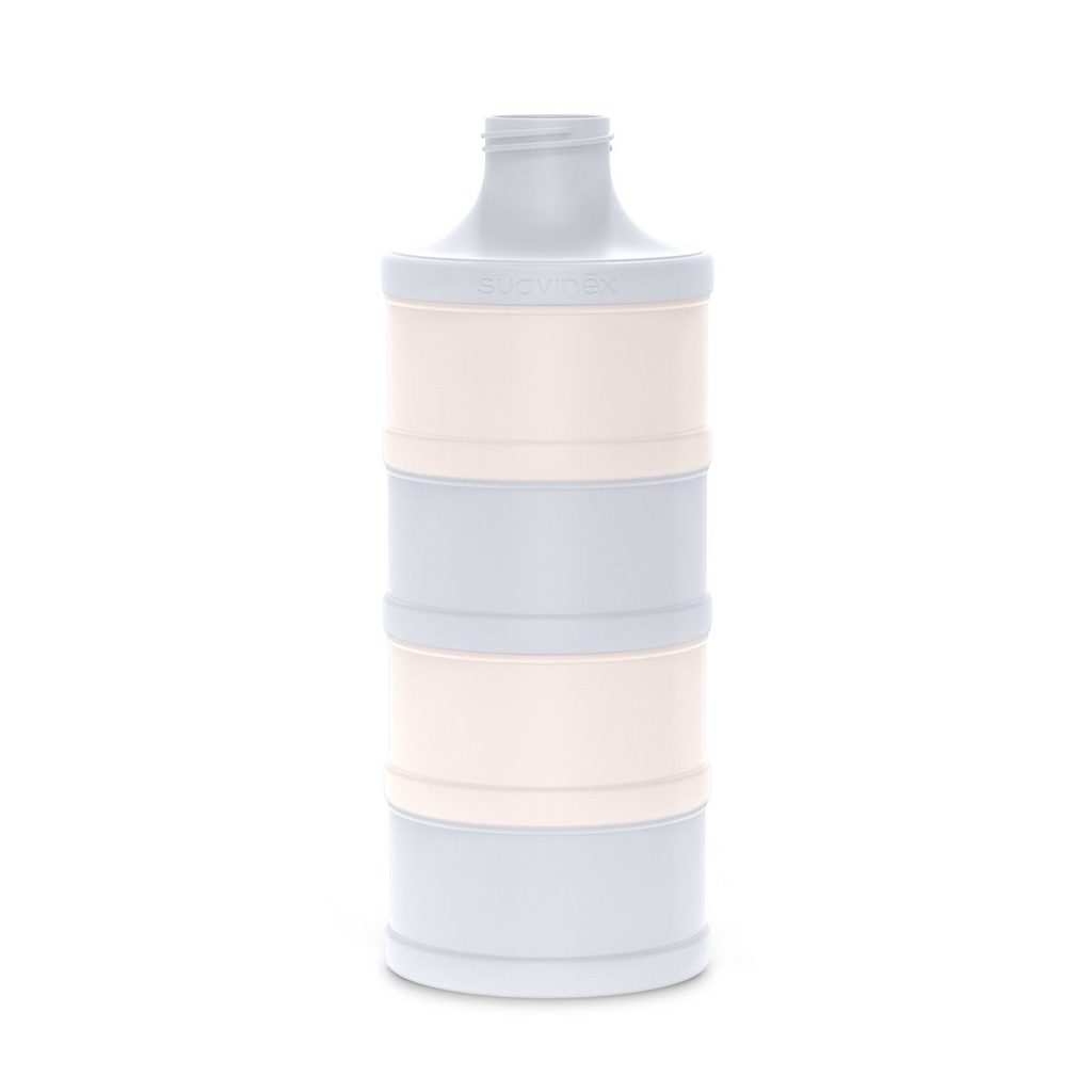 Dávkovač sušeného mléka značky Suavinex se šroubovacím uzávěrem a stohovatelnými přihrádkami. Obsahuje 4 samostatné části.