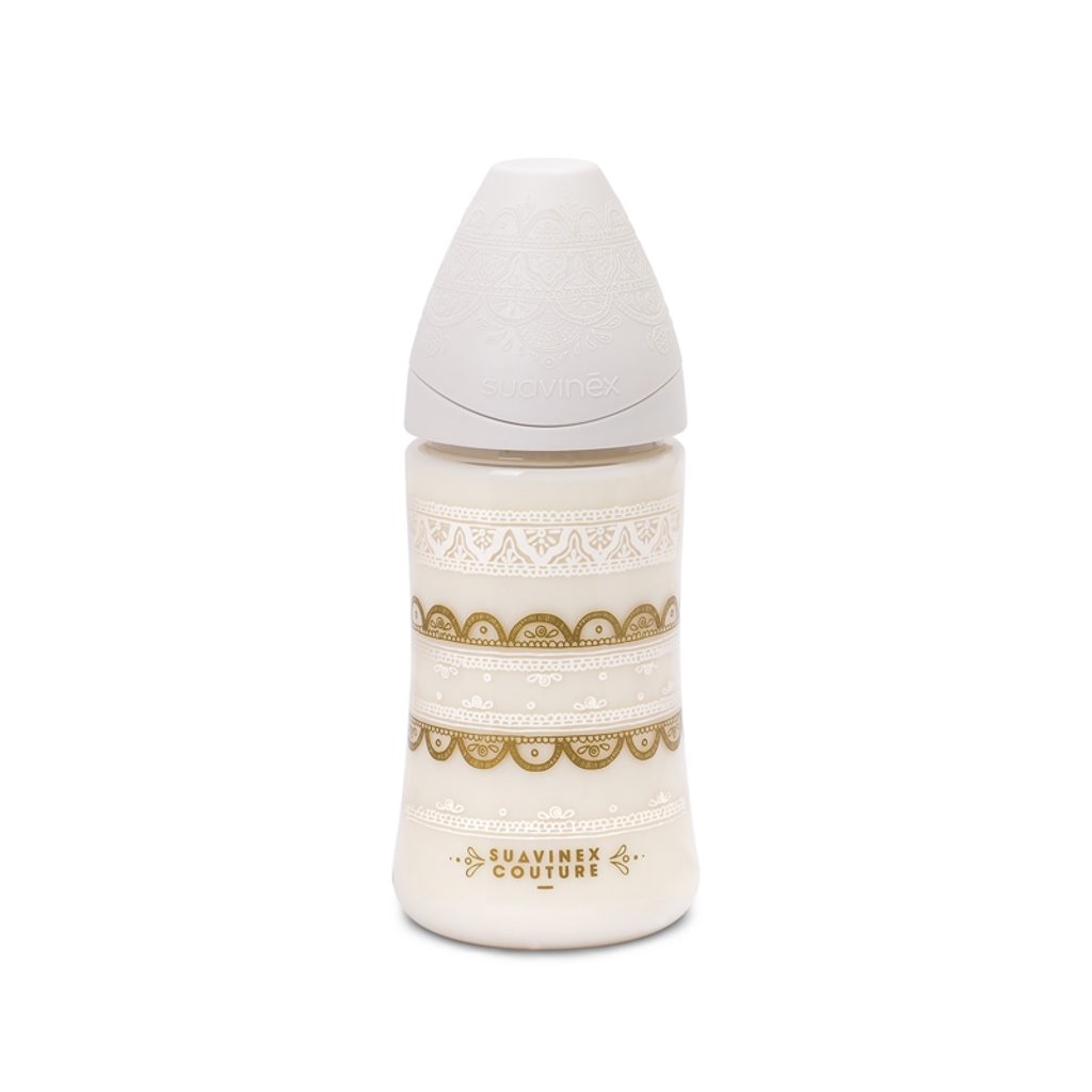Nechte se unášet luxusem španělské značky Suavinex. Nové překrásné průzračné a nadčasové materiály řady Premium Couture 2018 - láhve, dudlíky a klipy na dudlíky nesou prvky kombinací s nadčasovými materiály a detaily inspirovanými posledními trendy ve šperkařství. Průsvitnost, pozlacený povrch a nádherné zlaté aplikace řady Premium Couture 2018 Vás uchvátí! Zlaté odstíny vytvářejí originální osobité vzory kombinovatelné spolu s klipy a dudlíky řady Premium Couture 2018. Širokohrdlá láhev umožňuje rodičům snazší mytí a přípravu pokrmu a díky svému širokému dnu je lépe stabilní. Její ergonomický tvar podporuje lepší uchopení během krmení miminka. Má kulatou silikonovou savičku a anti-kolikové průduchy, které zamezují hromadění vzduchu a jeho polykání během krmení, čímž se snižuje pravděpodobnost vzniku novorozenecké koliky. Veškeré savičky i dudlíky jsou podpořeny a vyráběny ve spolupráci s Asociací španělských dětských ortodontistů a respektují přirozený vývoj dásní, zubů i patra dítěte. Barvy použity pro dekorování výrobků značky Suavinex jsou přírodní a netoxické, přehnané čištění je může poškodit. • Objem: 270 ml. • Tvar savičky: kulatá. • Velikost průtoku savičky: M (střední průtok). • Materiál savičky: silikon. • Doporučený věk: +0 měsíce. Vyrobeno v rámci EU. Veškeré výrobky jsou bez BPA, klinicky testované a vyrobené španělským farmaceutickým výrobcem.