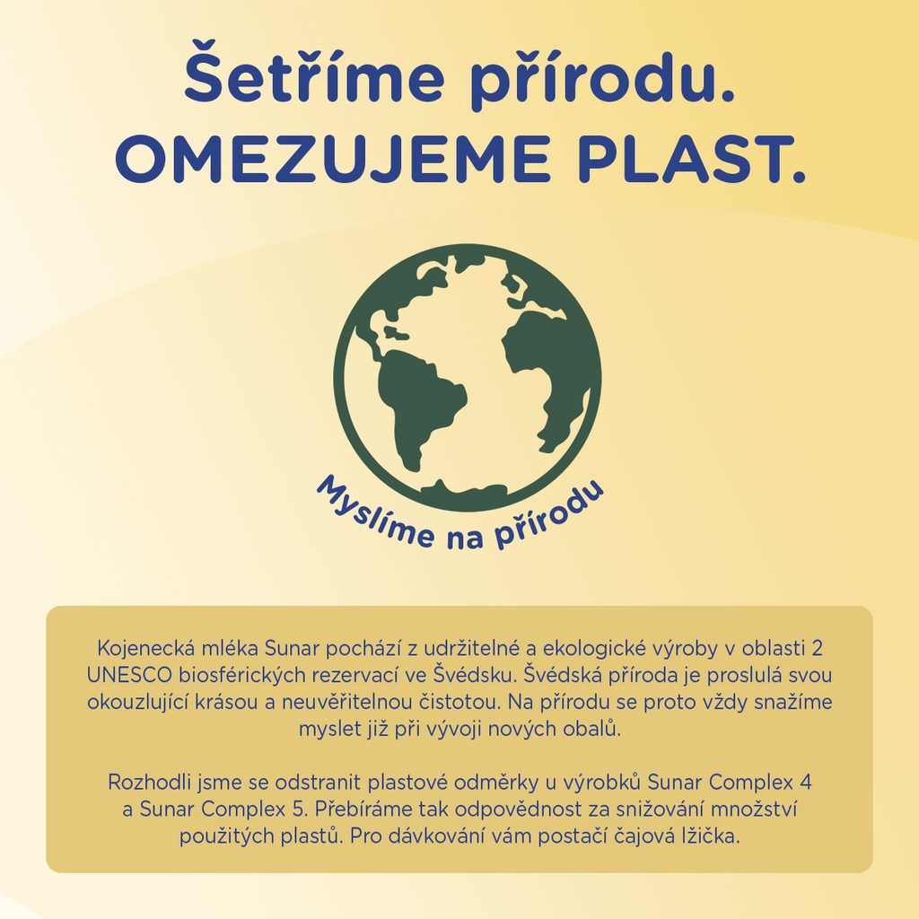 | Sunar Complex 5 je batolecí mléko z plnotučného mléka, bez palmového oleje. Vyvinuto podle vzoru mateřského mléka. Je určeno pro děti od ukončeného 36. měsíce a obsahuje unikátní kombinaci látek přirozeně se vyskytujících v mateřském mléce.
