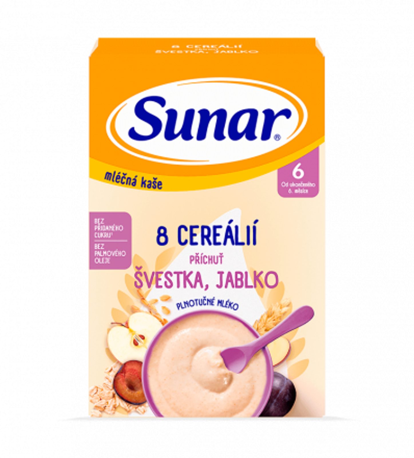 Sunar mléčná kaše s 8 cereáliemi s obsahem plnotučného mléka skvěle chutná a neobsahuje žádný přidaný cukr. Celozrnné cereálie v kaši jsou skvělým zdrojem vlákniny. Obsahuje lepek. Vhodné pro děti od uk. 6. měsíce.