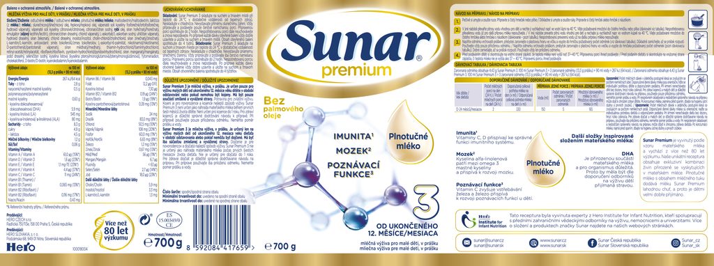 Kojení je pro novorozence a kojence nejlepší způsob výživy. Sunar Premium 3 není určen jako náhrada mateřského mléka během prvních šesti měsíců života dítěte. Není určen pro kojence do 1 roku. Pro zdraví kojenců je důležité správné dodržování návodu k přípravě. Při přípravě používejte pouze přiloženou odměrku. Neměňte poměr prášku a vody.