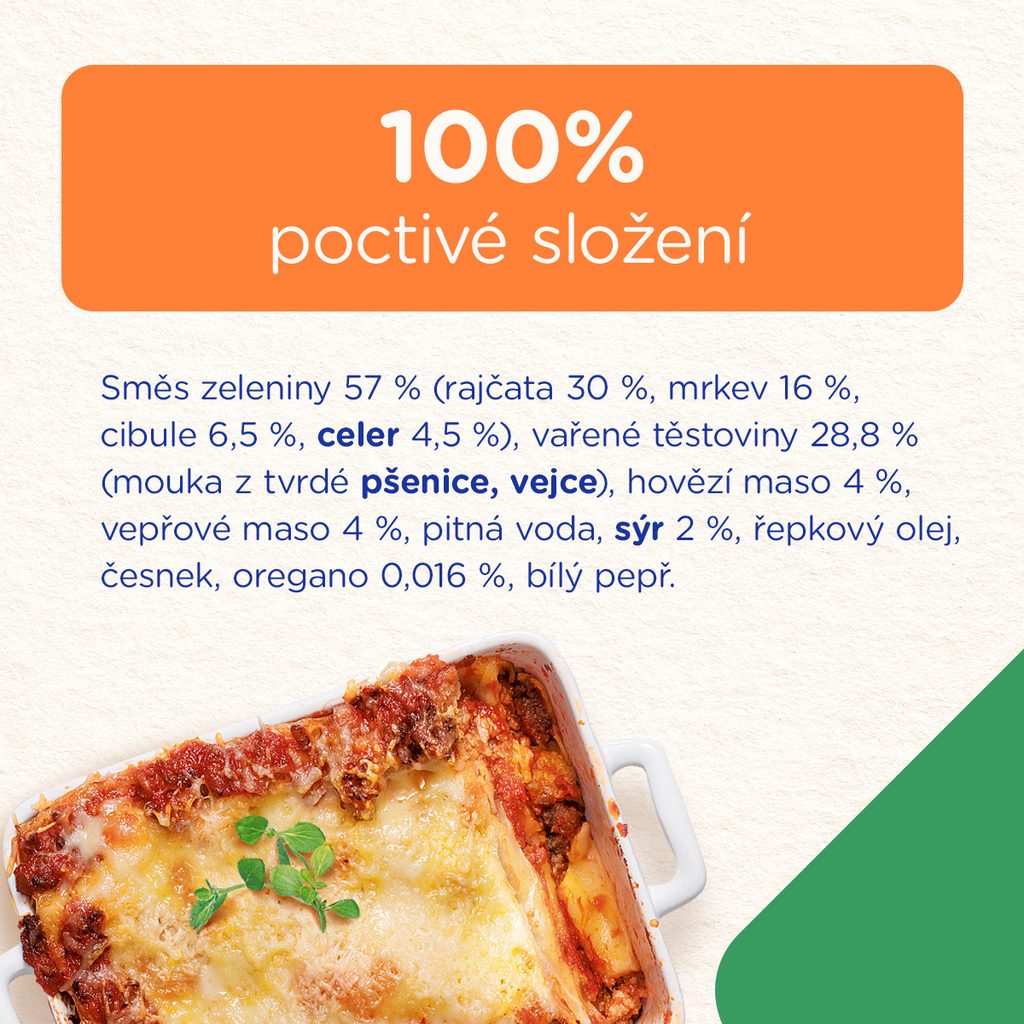 Regulovaný název: Lasagne s hovězím masem. Zelenino-masový příkrm. Potravina pro zvláštní výživu.