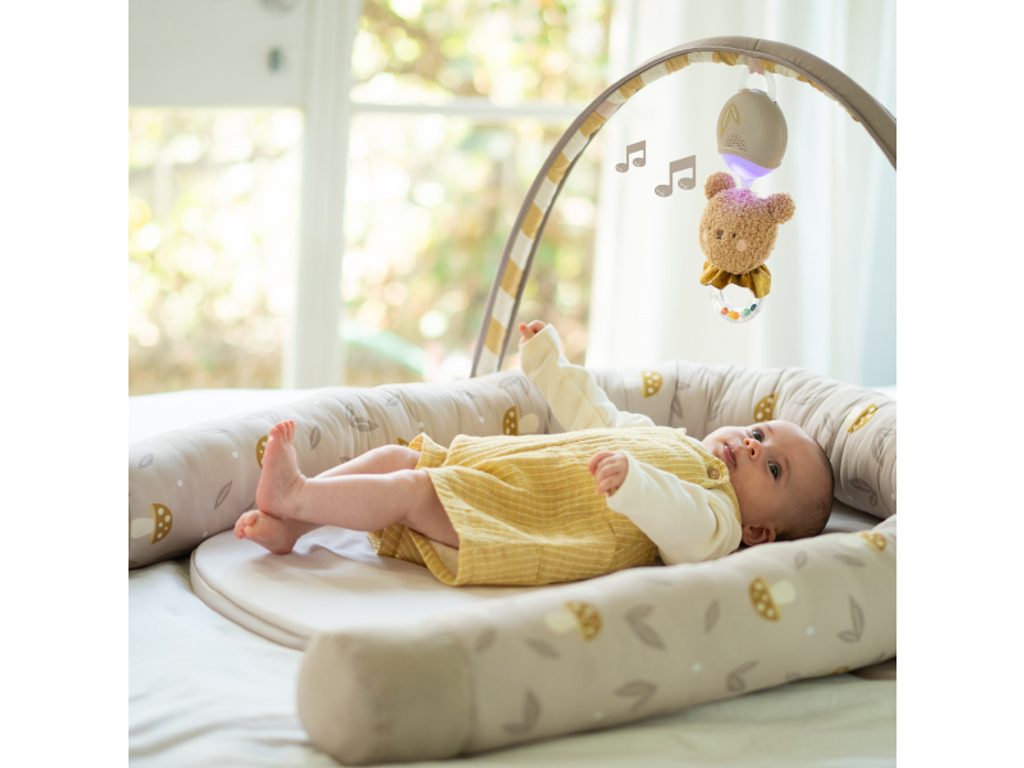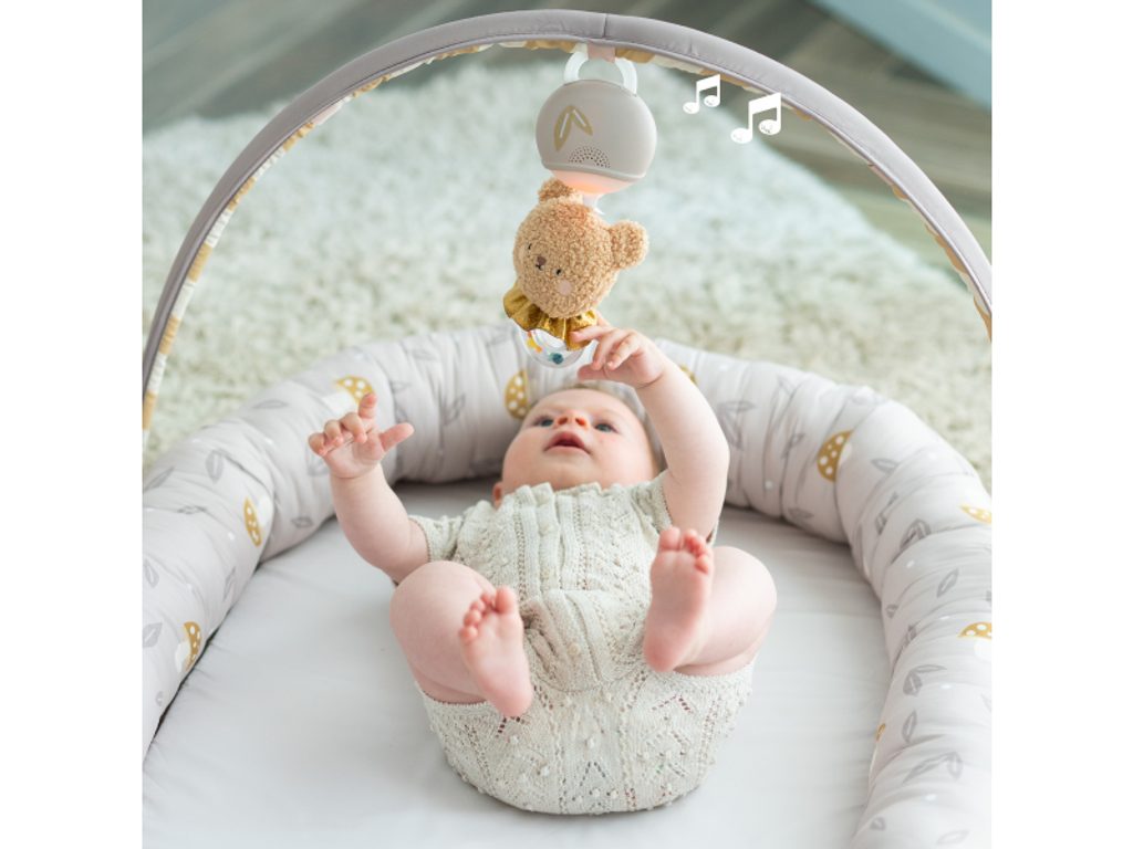 Od zhruba třetího měsíce lze hnízdo rozložit a proměnit ho v komfortní prostor pro hraní, pozorování okolí a první pokusy o přetáčení. Součástí je odnímatelná hrazda s plyšovým medvídkem, který svítí a nabízí až 22 minut uklidňujících melodií. Hudební medvídek se světýlky jde použít i samostatně – na postýlku, do kočárku nebo kamkoli, kde potřebujete miminko zabavit či uklidnit.