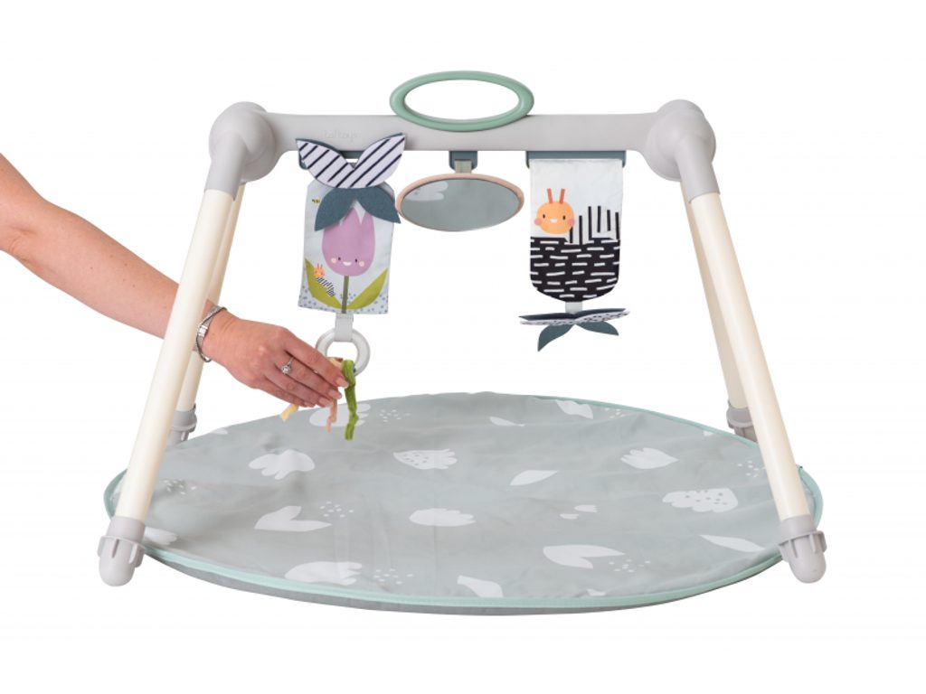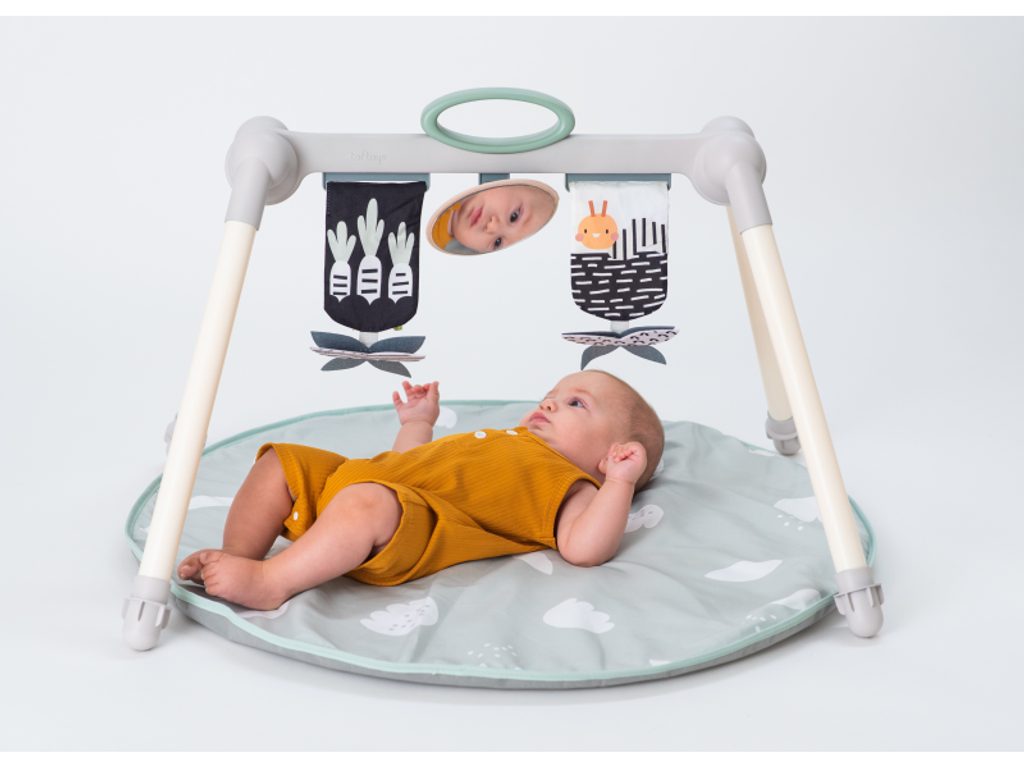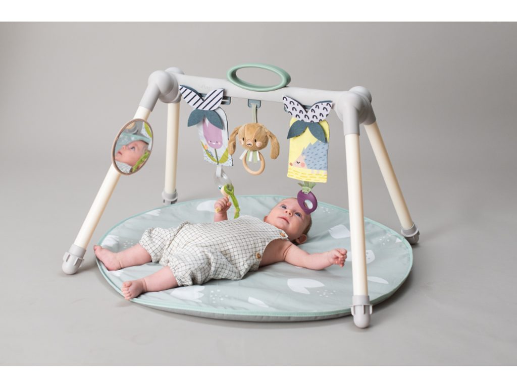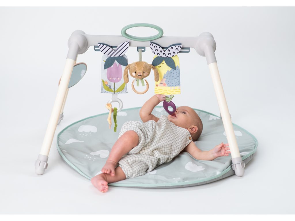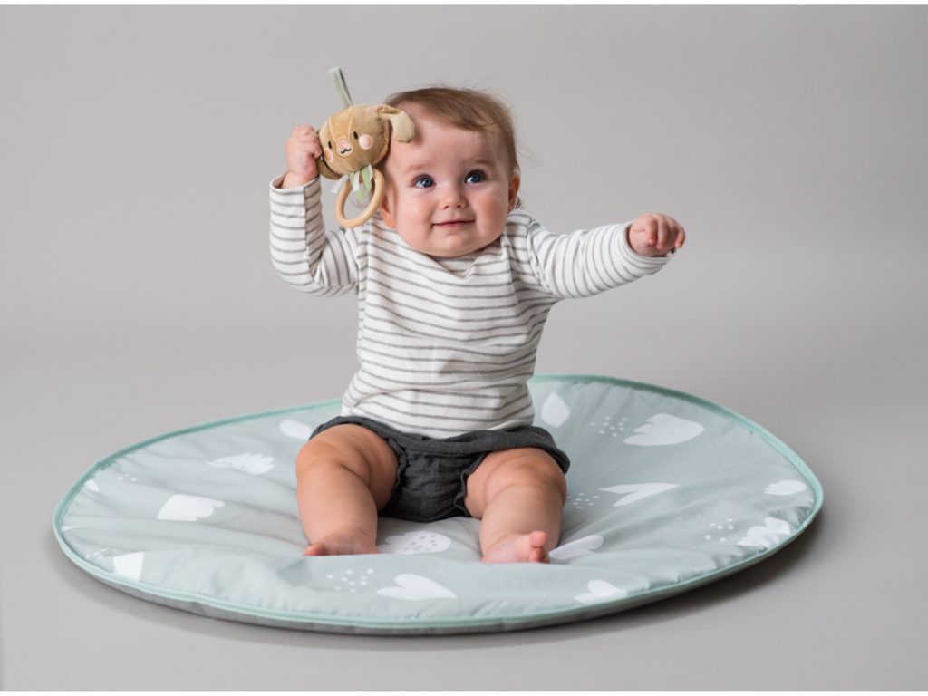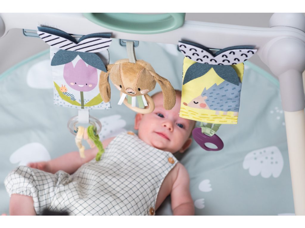 Stylová měkce polstrovaná hrací deka s různorodými aktivit pro zkoumání a objevování je navržena pro dvě věková stádia vývoje dítěte od narození. Obsahuje 4 odnímatelné závěsné hračky: cinkajícího králíčka Jenny zajíček s barevnými stužkami a dřevěným kroužkem, kulaté bezpečné zrcátko a dva oboustranné šusticí textilní panely s motýlkem na jednom konci a kroužkovým chrastítkem a kousátkem na druhém konci. Ilustrované panely nabízejí vysoce kontrastní černobílé obrázky pro děti od narození a barevné výrazné obrázky pro děti od 2 měsíců. Hraní se závěsnými hračkami podporuje rozvoj jednotlivých smyslů dítěte, jemné i hrubé motoriky a koordinace očí a rukou. Hrazda je skládací a vybavená držadlem pro snadné přenášení. Rozměry: 77 x 59 x 49 cm Vhodné pro děti od narození.