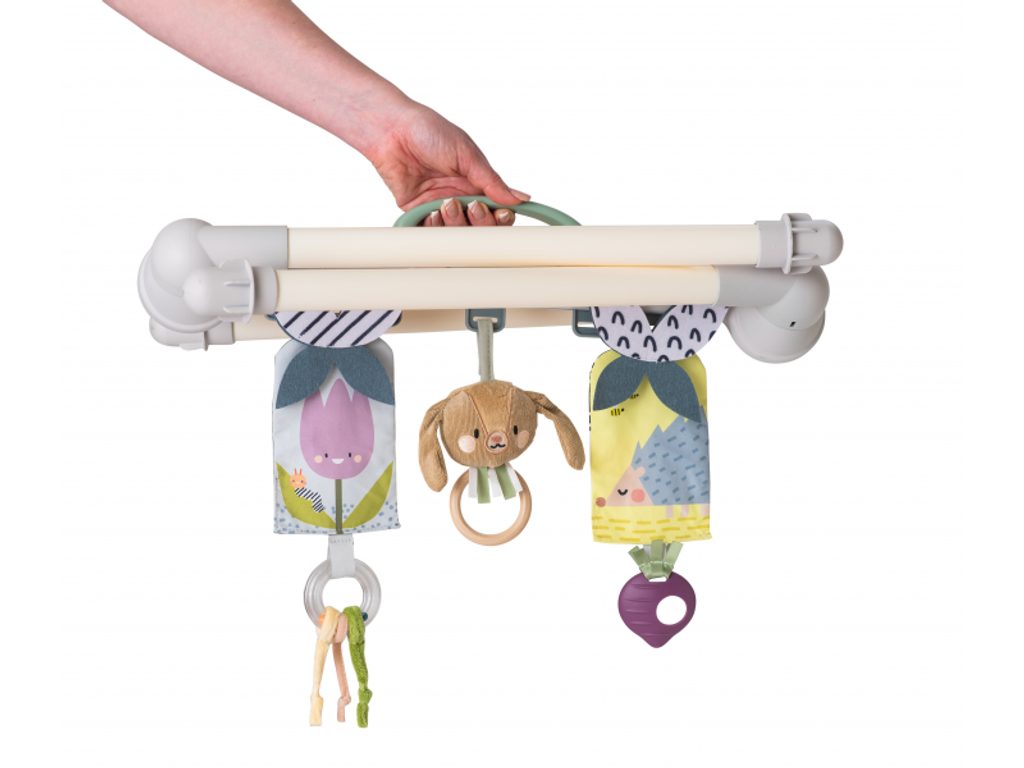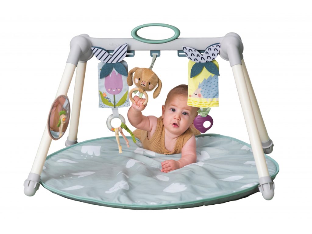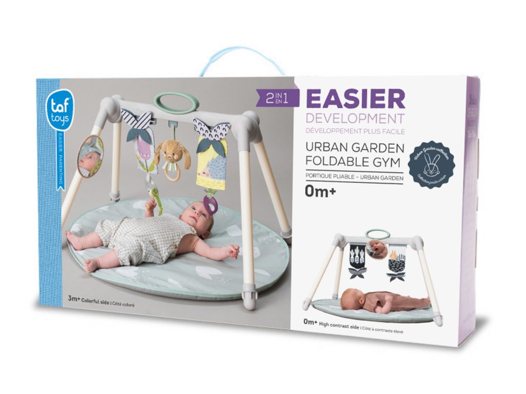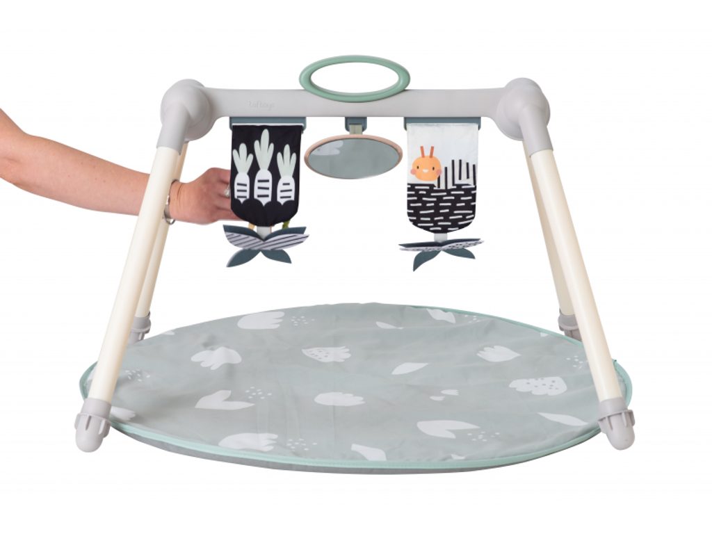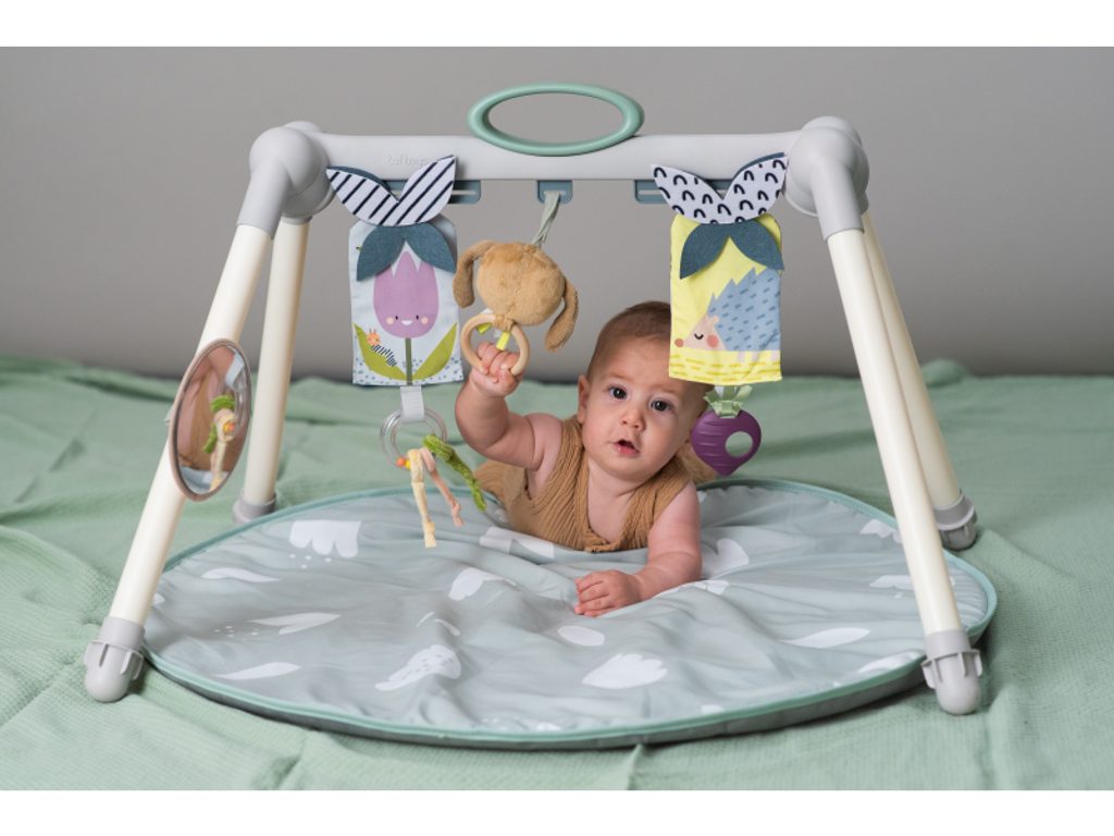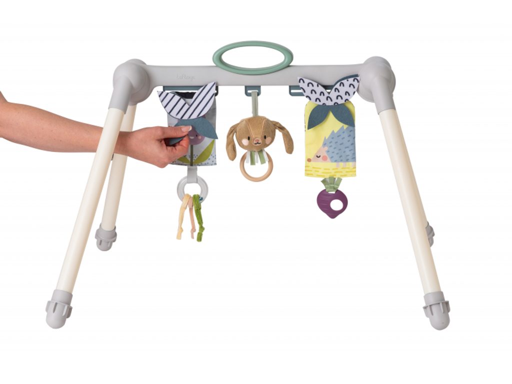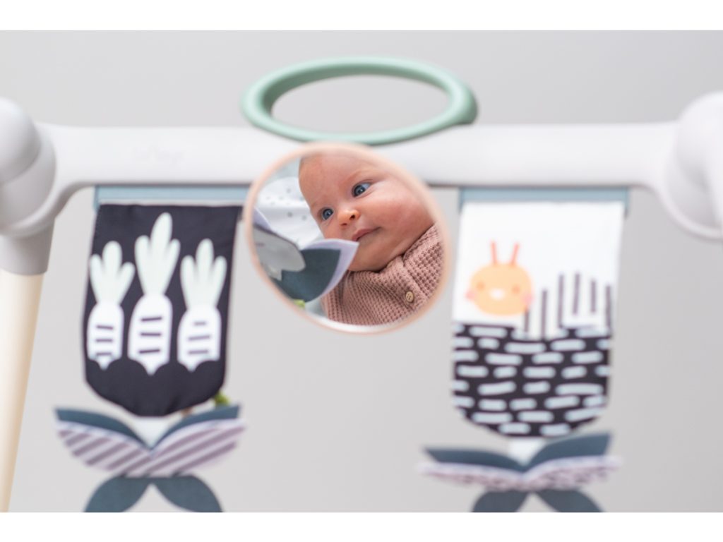 Stylová měkce polstrovaná hrací deka s různorodými aktivit pro zkoumání a objevování je navržena pro dvě věková stádia vývoje dítěte od narození. Obsahuje 4 odnímatelné závěsné hračky: cinkajícího králíčka Jenny zajíček s barevnými stužkami a dřevěným kroužkem, kulaté bezpečné zrcátko a dva oboustranné šusticí textilní panely s motýlkem na jednom konci a kroužkovým chrastítkem a kousátkem na druhém konci. Ilustrované panely nabízejí vysoce kontrastní černobílé obrázky pro děti od narození a barevné výrazné obrázky pro děti od 2 měsíců. Hraní se závěsnými hračkami podporuje rozvoj jednotlivých smyslů dítěte, jemné i hrubé motoriky a koordinace očí a rukou. Hrazda je skládací a vybavená držadlem pro snadné přenášení. Rozměry: 77 x 59 x 49 cm Vhodné pro děti od narození.