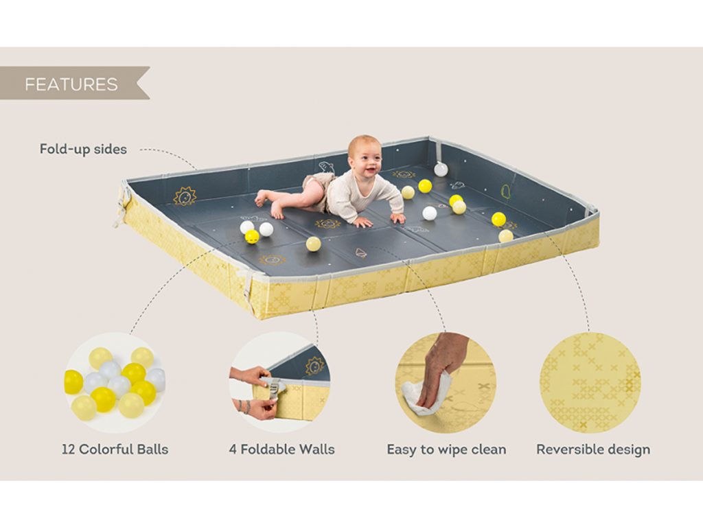Tato extra velká, oboustranná pěnová hrací deka je ideální pro pohodlí a zábavu vašeho dítěte už od narození. Unikátní zvednuté okraje vytvářejí bezpečnou, uzavřenou plochu, která udržuje hračky a míčky na místě a poskytuje dítěti pocit bezpečí. Jak dítě roste, můžete okraje snadno položit, čímž zvětšíte hrací plochu. Rozměr deky je 150 x 180 cm, a po složení ji snadno uložíte do kompaktní velikosti, ideální pro přenášení i skladování (taška na zip je součástí balení). Deka je vyrobena z měkkého materiálu s voděodolným povrchem, což ji činí vhodnou pro použití jak doma, tak i venku. Oboustranný design s krásným potiskem nabízí dvě různé varianty. Součástí balení je také 12 barevných míčků, které podporují dětskou zábavu. Materiál deky je zcela bezpečný pro zdraví vašeho dítěte a neobsahuje BPA, PVC, olovo, ftaláty ani rtuť. Údržba je velmi jednoduchá, stačí otřít. Deka je vhodná pro děti od narození.