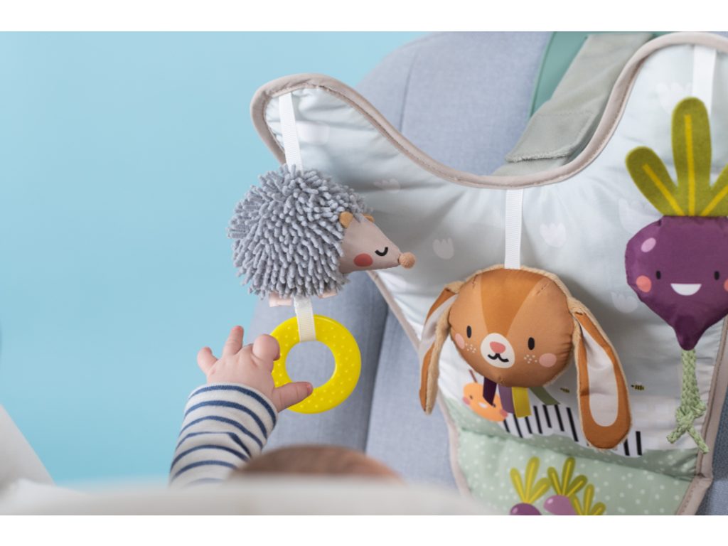 Hrací pultík se zavěšenými textilními hračkami a krásnými ilustracemi ze života na zahradě zabaví během jízdy dítě sedící v autosedačce proti směru jízdy. Velké zpětné zrcátko umožňuje rodiči dítě sledovat během jízdy. Pultík nabízí ke zkoumání chrasticího králíčka, šusticí řepu a cinkajícího ježka. Snadné připevnění do auta s pomocí suchého zipu. Hrací pultík a zpětné zrcátko lze používat i samostatně. Pro děti od narození.