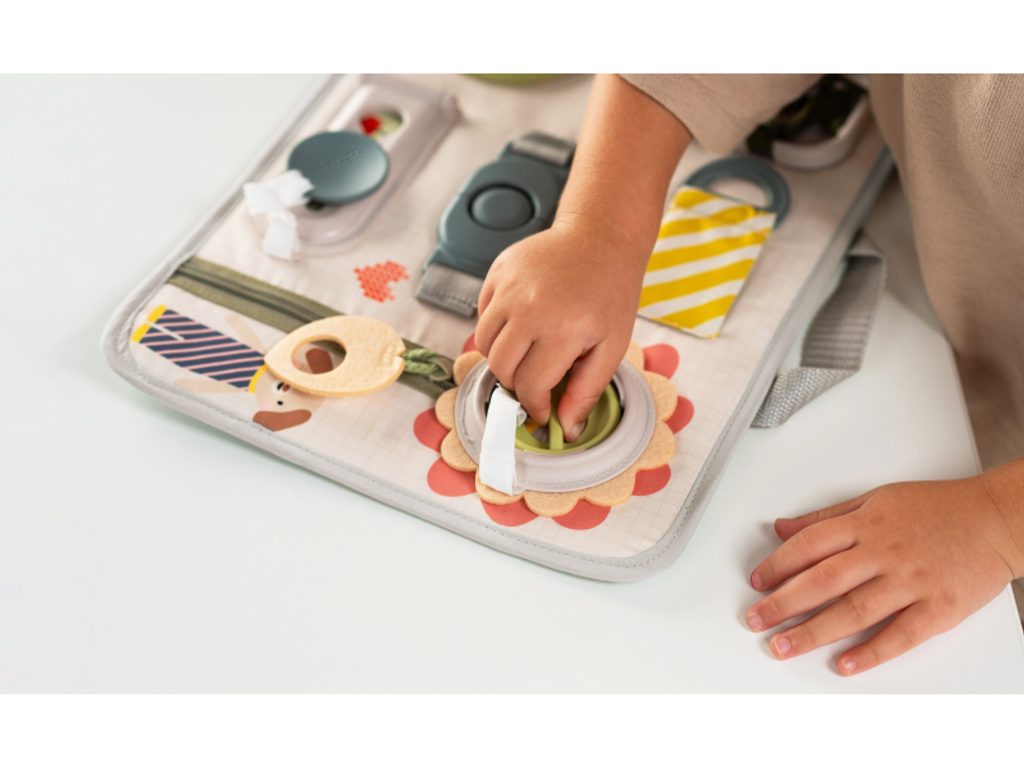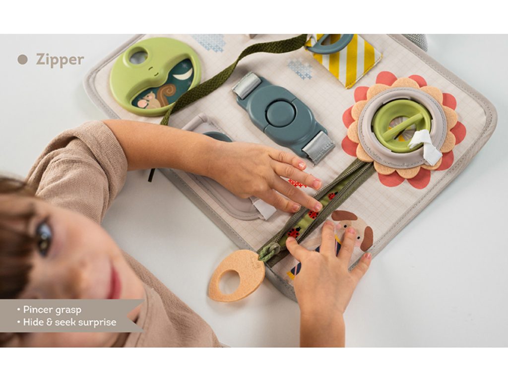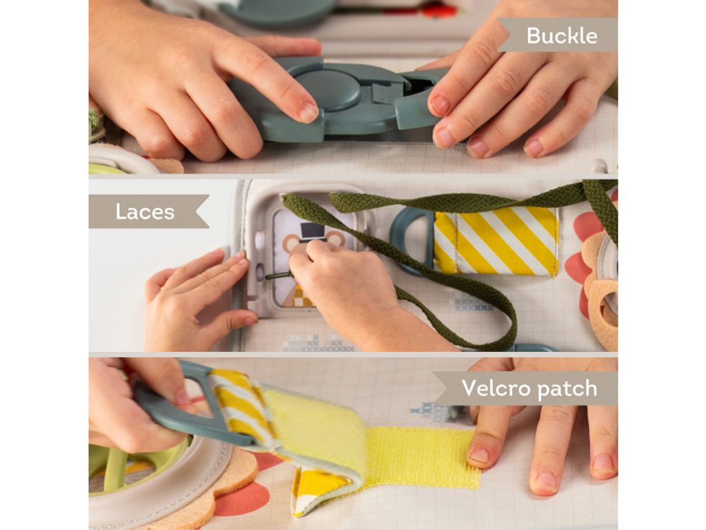 Tento unikátní hrací pult nabízí širokou škálu různých aktivit, jako jsou zip, velký knoflík, suché zipy, tkaničky, přezka, poutko a další. Děti si procvičují jemnou motoriku a koordinaci oko-ruka při zapínání a rozepínání jednotlivých prvků. Aktivity zároveň podporují kreativitu a rozvoj schopnosti řešit problémy. Hrací pult je určen pro děti od 18 měsíců.