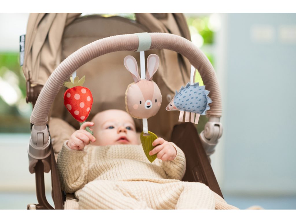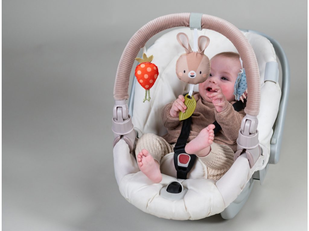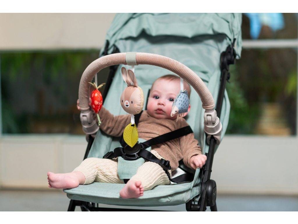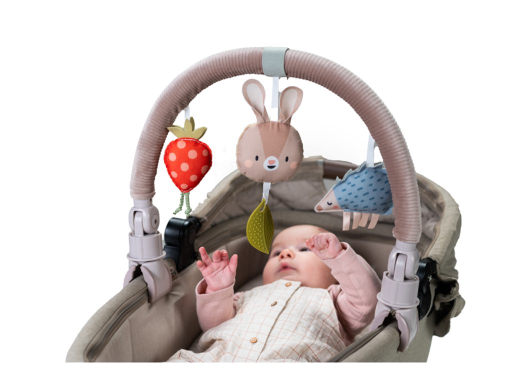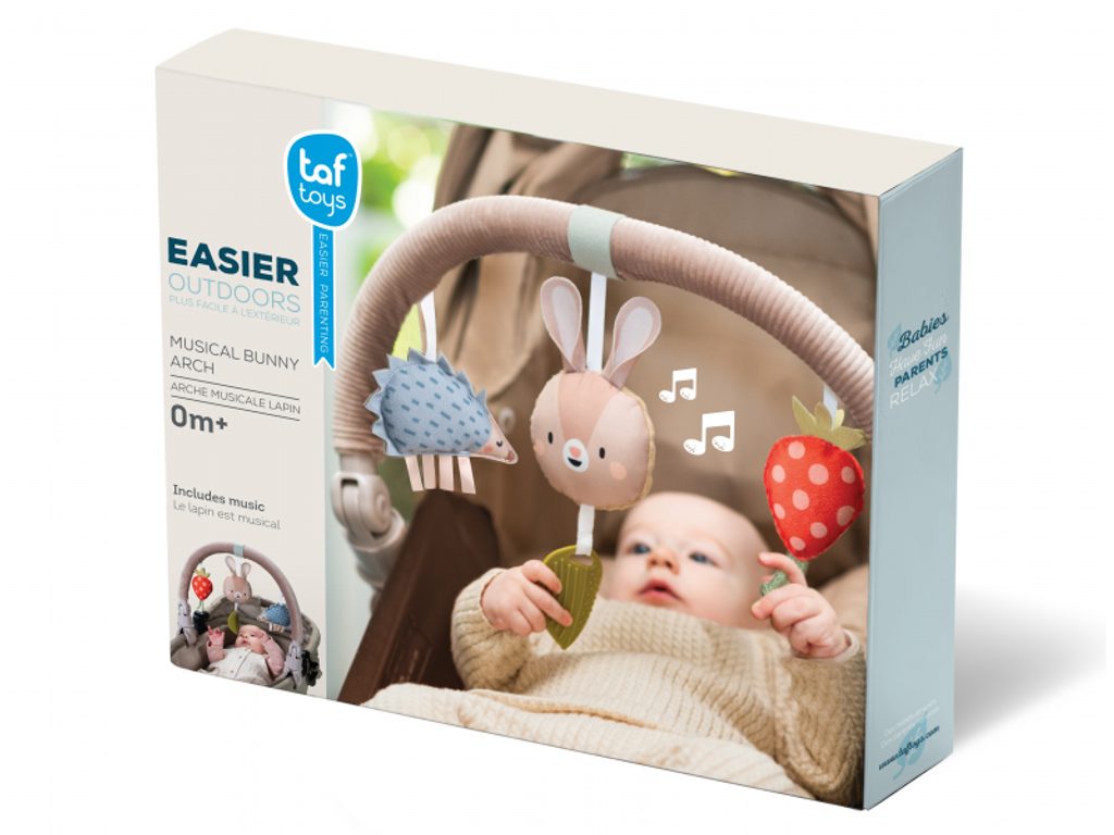 Hudební hrazda určená k připevnění na kočárek nebo autosedačku zabaví vaše miminko na cestách. Snadno ji s pomocí flexibilních plastových klipsů připevníte k většině kočárků i autosedaček. Pozornost dítěte upoutá králíček, který po lehkém doteku hraje melodii, chrasticí ježek i cinkající jahůdka. Hračka rozvíjí motoriku a učí vztahu příčiny a následku. Baterie 3xLR44 jsou součástí. Vhodné od narození.