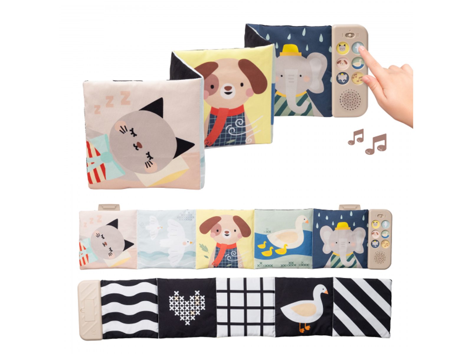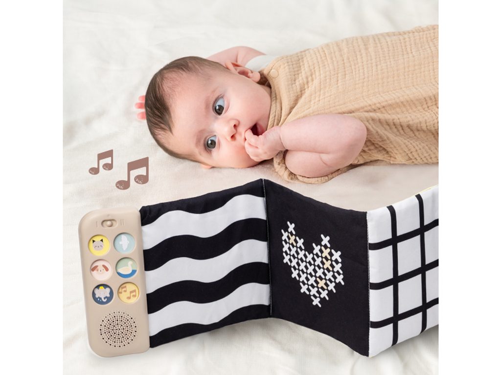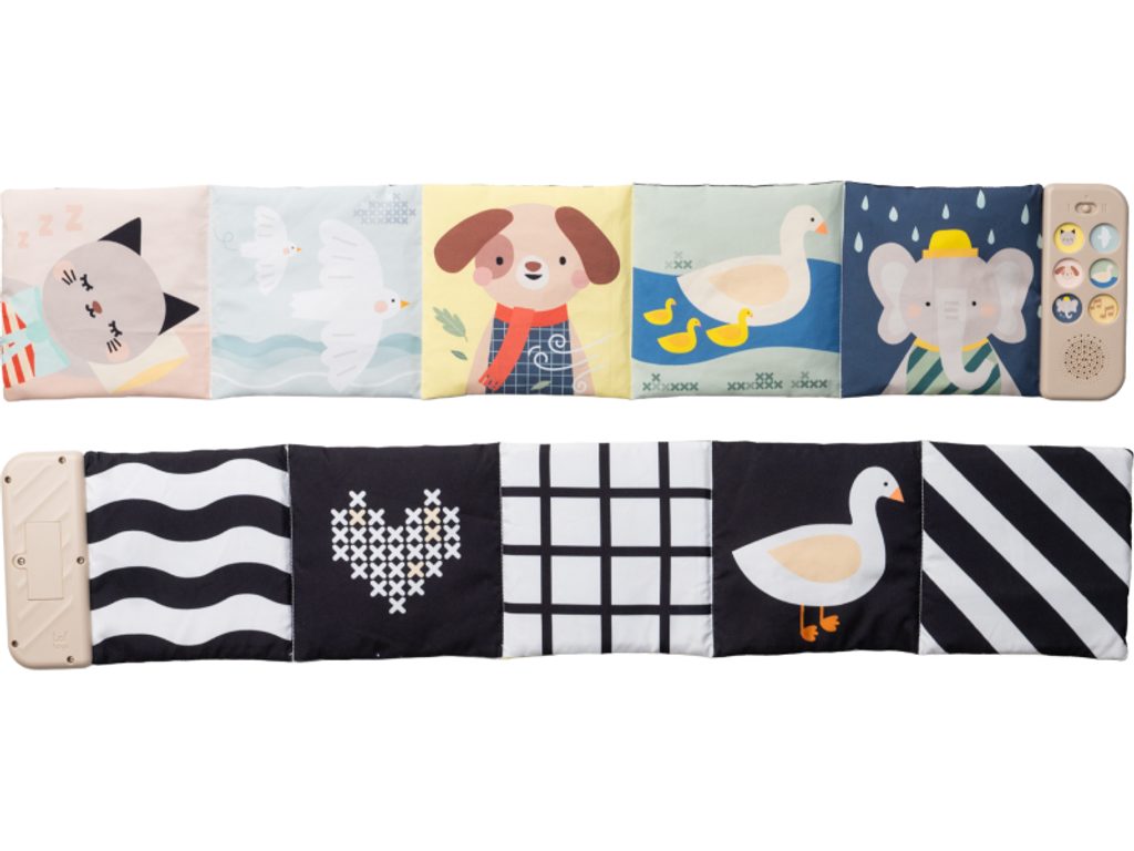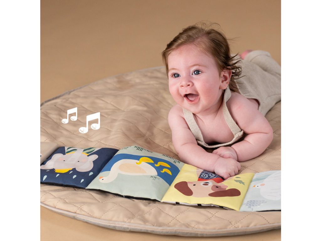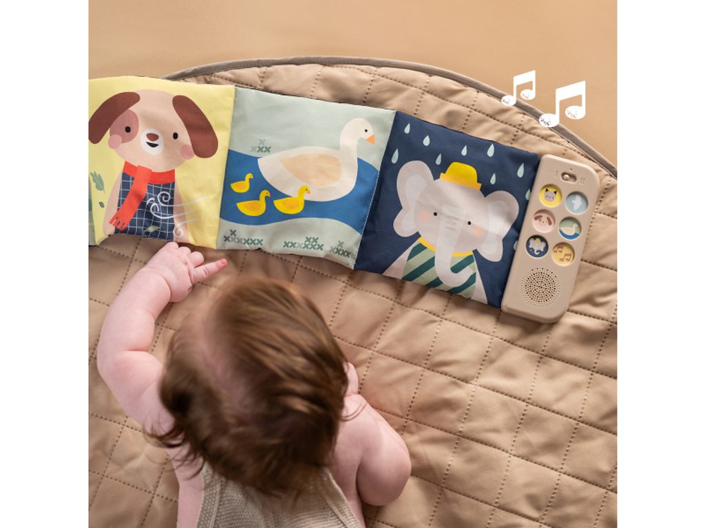 Součástí je hudební modul s jednoduchým ovládáním pomocí tlačítek. Nabízí pět realistických zvuků zvířátek (pes, kočka, slon, kachna a ptáčci), pět zvuků přírody (šumění, mořské vlny, déšť, proudění řeky, tlukot srdce) a sedm minut uklidňujících melodií, které pomáhají miminko zaujmout, zklidnit a navodit příjemnou atmosféru před spánkem. Kombinace obrázků, zvuků a jemných textur podporuje rozvoj jemné motoriky, smyslového vnímání, emoční inteligence i chápání příčiny a následku – dítě postupně objevuje, že stisk tlačítka spustí konkrétní zvuk.