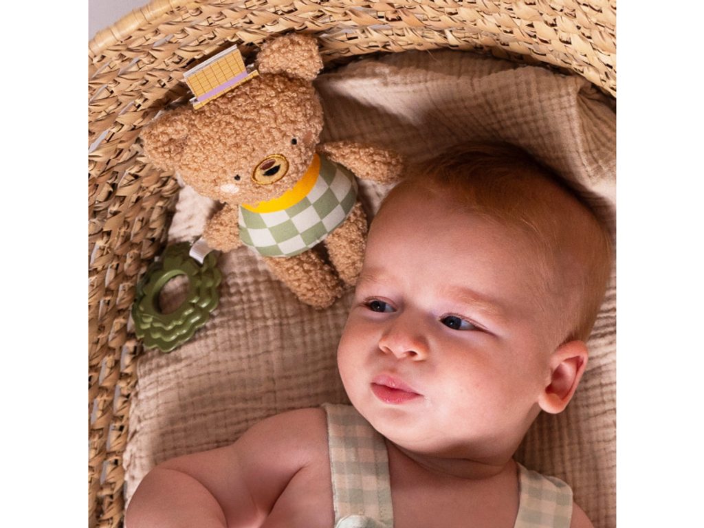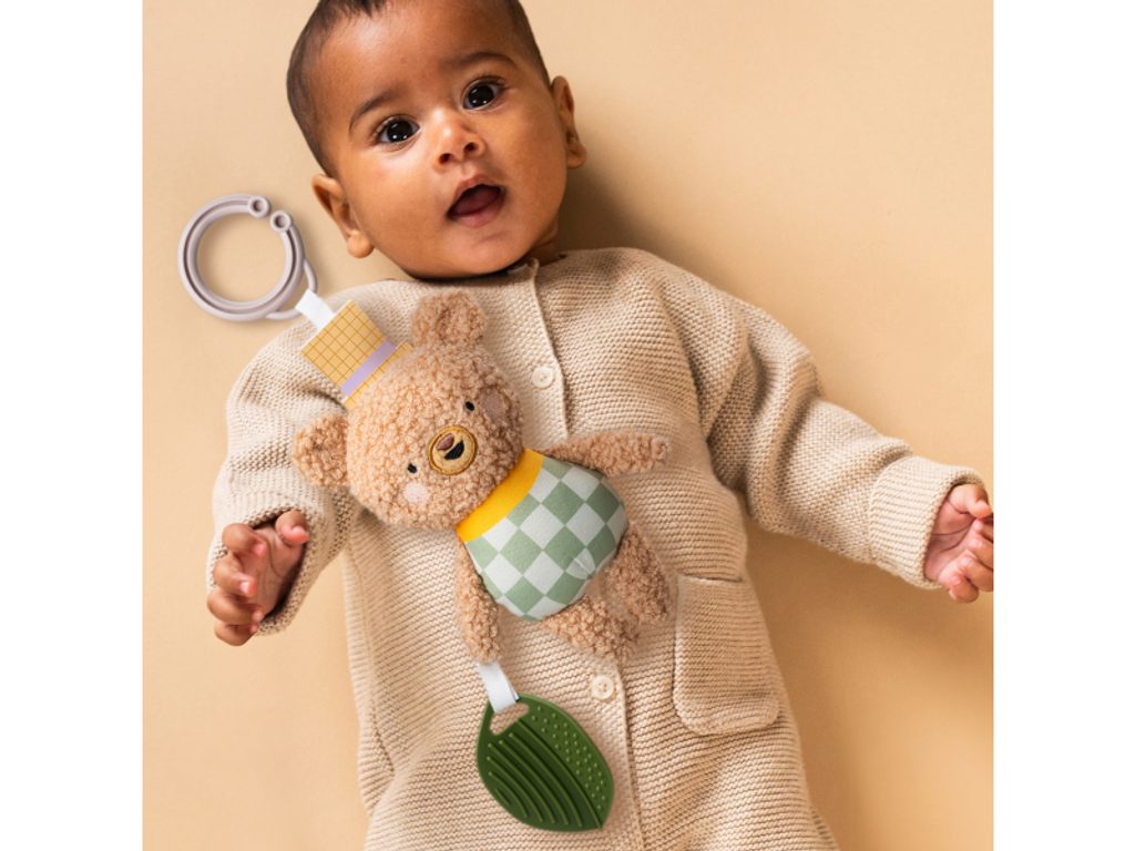 Závěsná plyšová hračka v podobě roztomilého medvídka Brendona při pohybu chrastí a při zmáčknutí šustí. Součástí hračky je i pružné kousátko ve tvaru listu. Díky závěsnému kroužku hračku snadno připevníte např. na autosedačku či kočárek. Hračka pomáhá rozvíjet jednotlivé smysly, motoriku a emoční inteligenci dítěte. Vhodné pro děti od narození.
