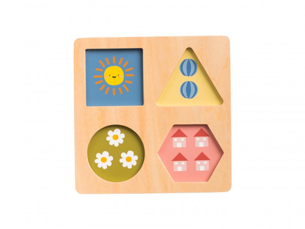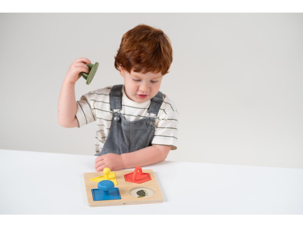 Vkládací puzzle různých tvarů s úchyty a výměnným pozadím v otvorech pomáhají učit dítě barvy, zvířátka, ovoce i počítání a rozvíjí jeho jemnou motoriku. Úchyty jednotlivých dílků mají různý tvar, takže vyžadují různé způsoby úchopu. Vkládací puzzle dílky můžete využít i jako razítka. Sada obsahuje dřevěnou základnu, 4 silikonové vkládací tvary s úchyty a 2 oboustranné karty s ilustracemi (barvy, zvířátka, ovoce a počty). Rozměry základny: 20 x 20 cm Vyrobeno ze zdravotně nezávadných materiálů, které jsou zcela bezpečné pro zdraví vašeho dítěte a neobsahují BPA, PVC, olovo, ftaláty ani rtuť. Vhodné pro děti od 18 měsíců.