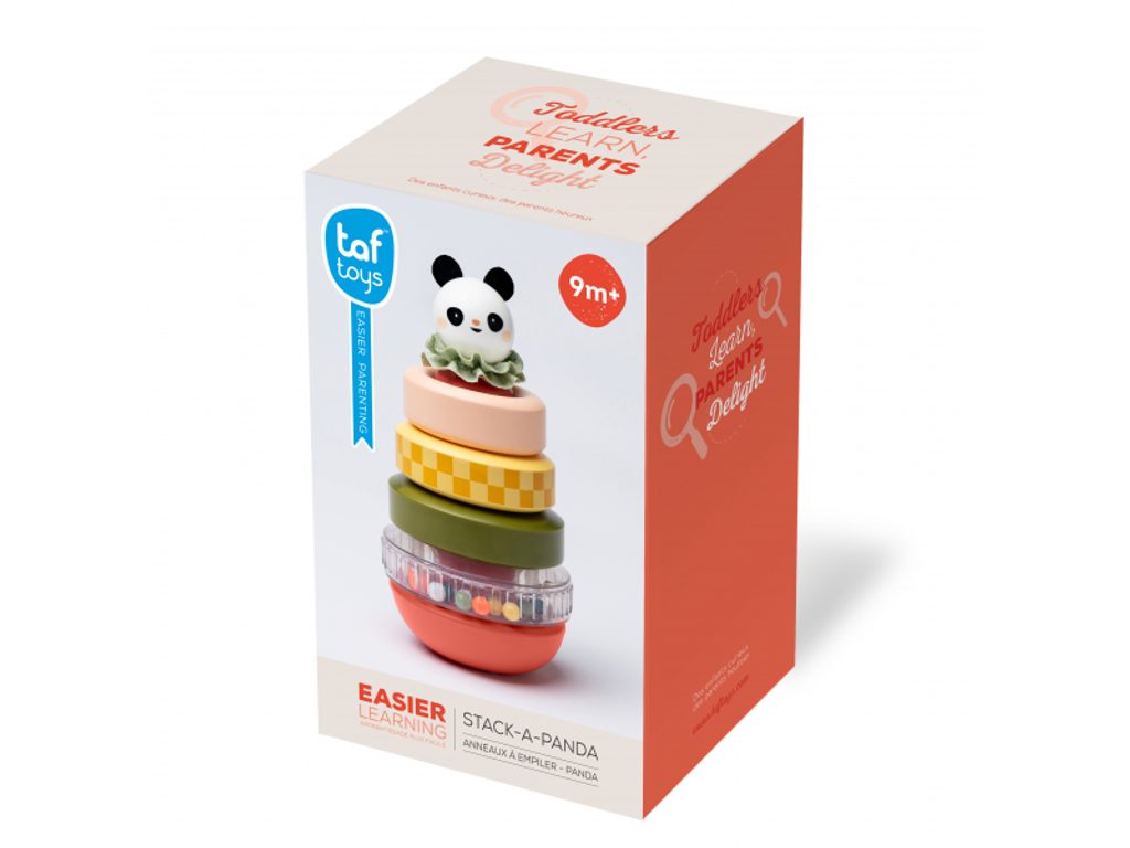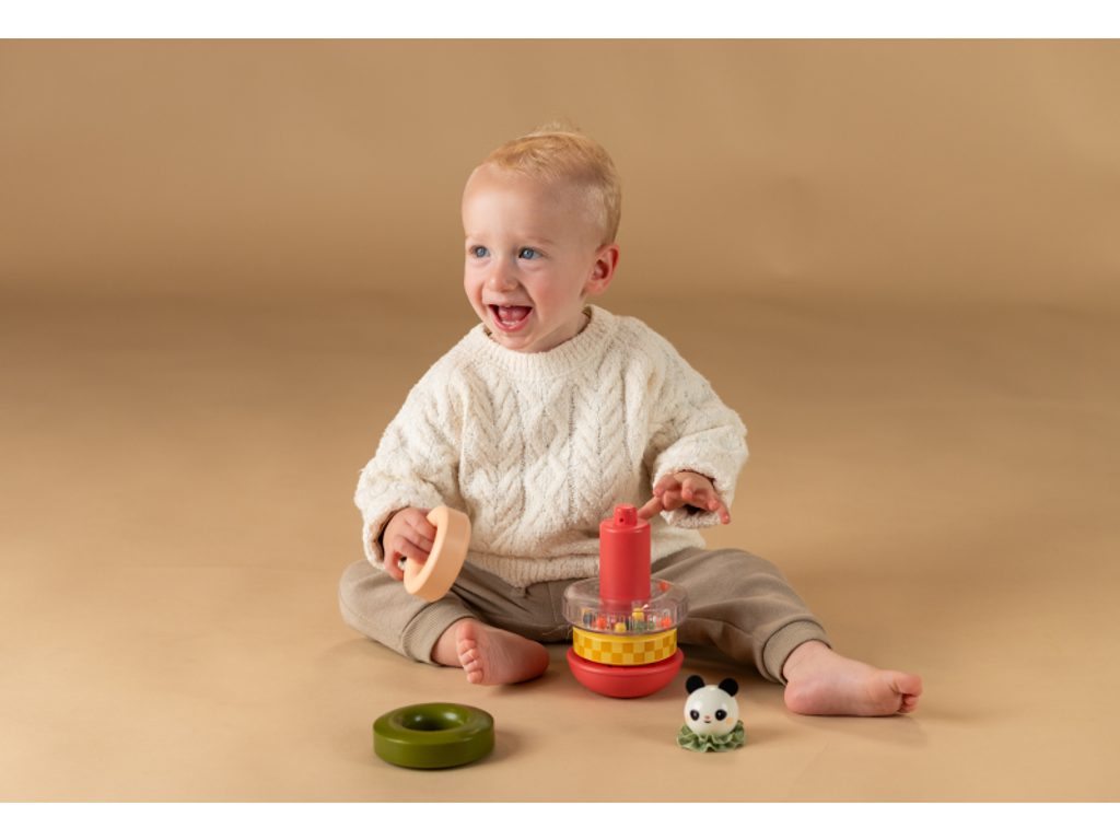 Barevná pyramida s roztomilou pandí hlavičkou je zábavná a smyslově podnětná hračka, která podporuje jemnou motoriku, koordinaci a první logické uvažování dítěte. Podnětné hraní pro všechny smysly: Obsahuje čtyři kroužky – dva plné, jeden se vzorem a jeden průhledný s chrastícími kuličkami Děti si při hraní osahají různé textury a tvary, uvidí kontrasty a zaslechnou zvuky – to vše stimuluje zrak, sluch i hmat Každý kroužek lze postavit na bok a kutálet po zemi, čímž podporuje lezení a pohyb Podpora vývoje dovedností: Stohování kroužků zlepšuje koordinaci oko–ruka a jemnou motoriku Děti si při skládání trénují řešení problémů a prostorové vnímání Hračka je ideální pro učení barev, velikostí a pořadí Vhodné pro děti od 9 měsíců.