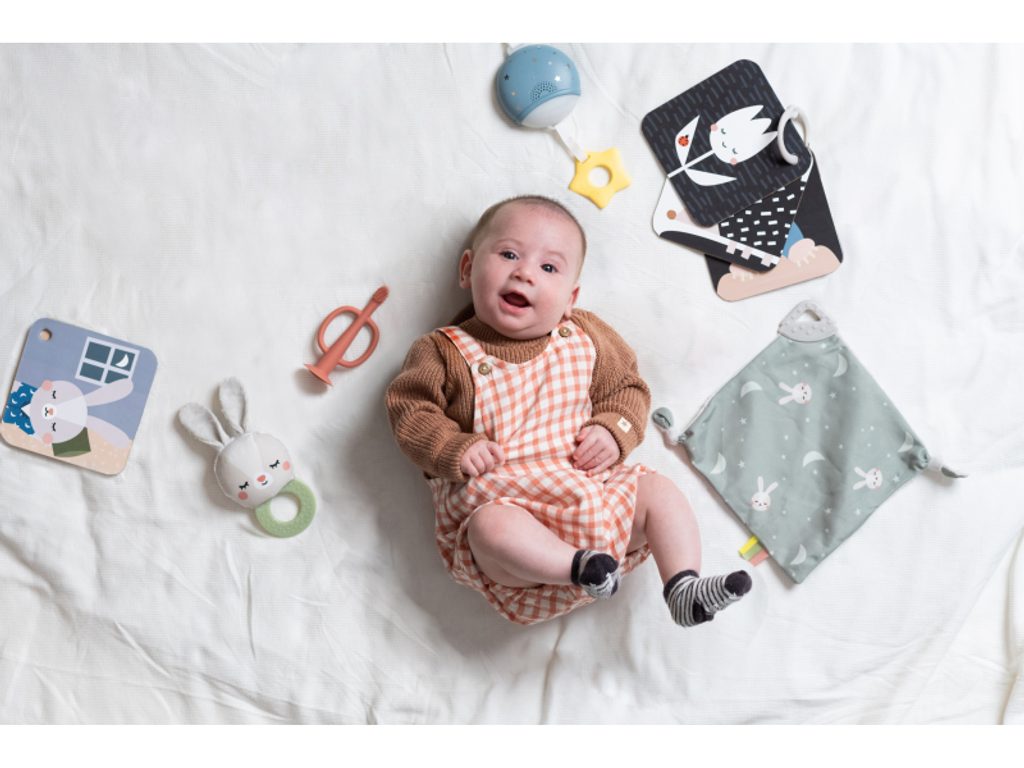 Speciálně sestavená sada hraček a doplňků pomáhá k uklidnění a zabavení dítěte před spaním. Sada obsahuje jemné noční světýlko hudbou, měkký silikonový kartáček na zoubky, muchláčka s kousátkem, kousátko králíčka a 7 oboustranných ilustrovaných karet s kroužkem pro spojování. Hudební box nabízí 20 minut uklidňujících melodií a zvuků. Společně s jemným světýlkem vytváří klidnou atmosféru v postýlce pro lepší usínání dítěte. Ilustrované karty poskytují rodiči náměty na vymýšlení příběhů, které mohou dítěti vyprávět před spaním. Během dne karty s výraznými kontrastními obrázky využijete pro zabavení dítěte na hrací dece i v kočárku či autosedačce. Sada je vhodná i jako dárek k narození miminka. Rozměry balení: 30 x 26 x 7 cm Vhodné pro děti od narození.