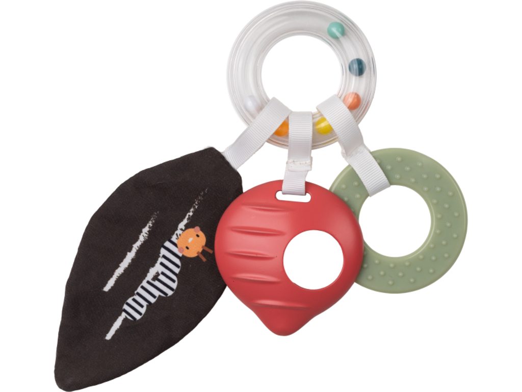 Kroužkové chrastítko s kousátky a šustivým listem napomáhá rozvoji jemné motoriky a koordinaci rukou. Je skvělým společníkem pro zklidnění bolavých dásní při růstu prvních zoubků.