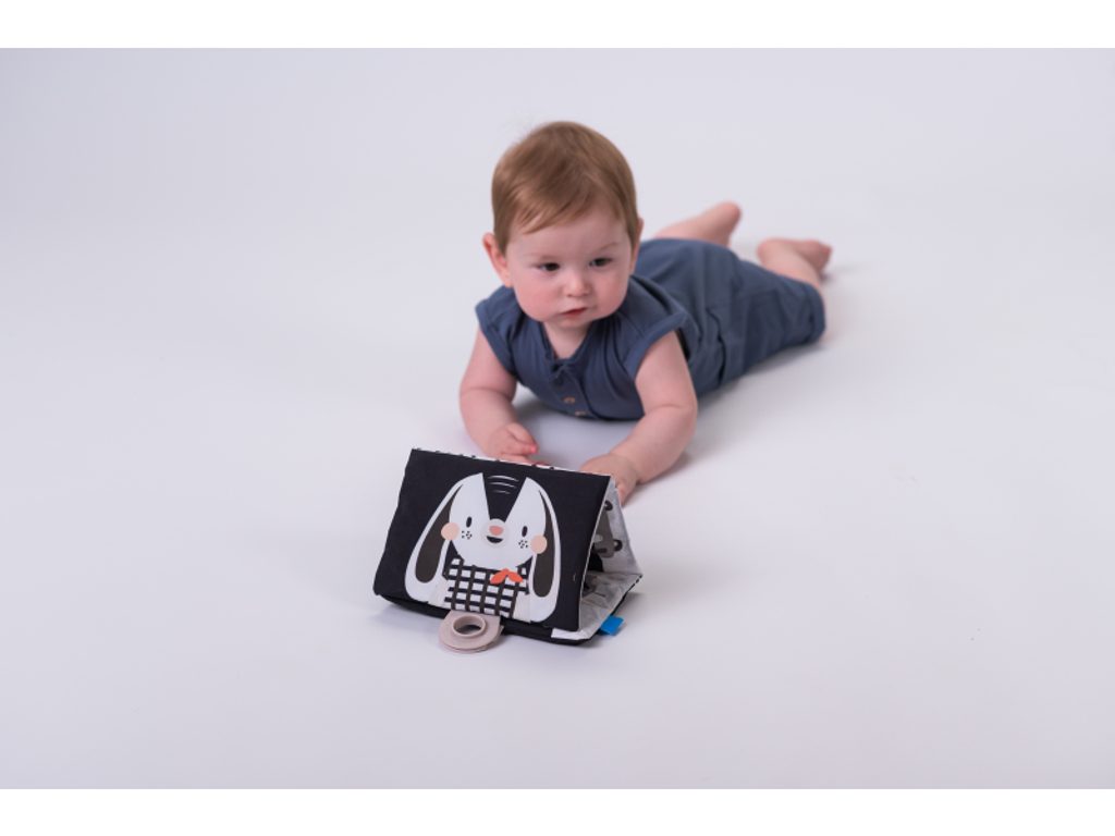 Černobílá šustivá knížka je ideální pro hru na bříšku. Díky kontrastním barvám a jemnému šustění stimuluje zrak i sluch, což je klíčové pro první smyslový rozvoj.
