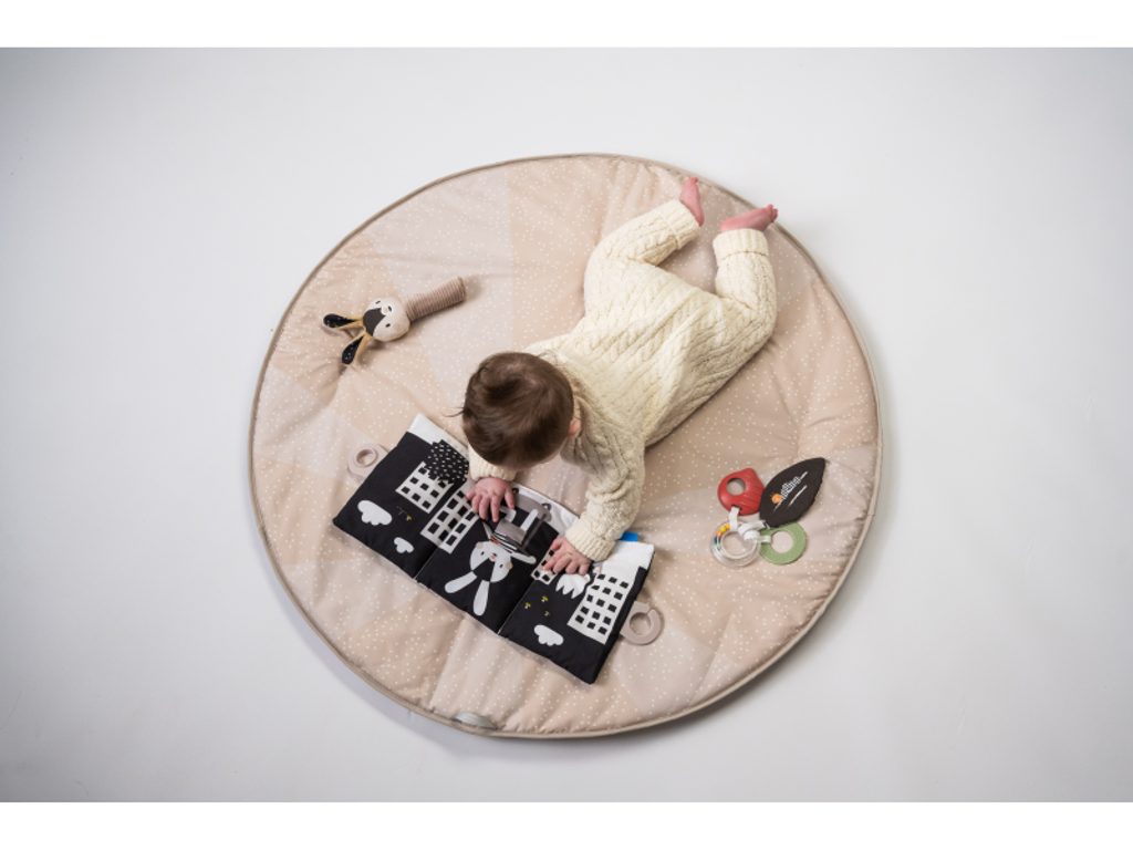 Každý prvek v dárkovém boxu lze používat samostatně, což umožňuje přizpůsobit hru aktuálním potřebám dítěte a podpořit jeho optimální rozvoj. Knížka se dá snadno připevnit na postýlku, kočárek nebo autosedačku, takže dítě zabaví i na cestách. Kolotoč zase můžete zavěsit na hrazdu hrací deky nebo na kočárek.