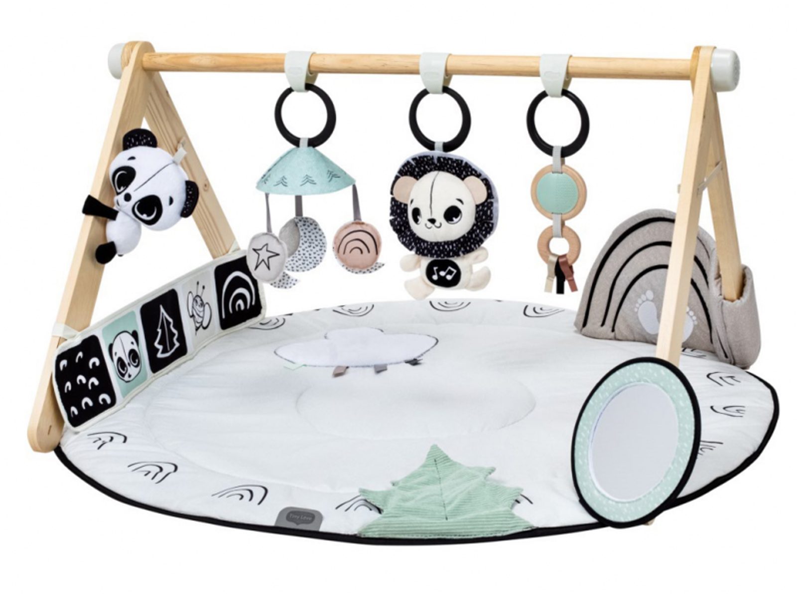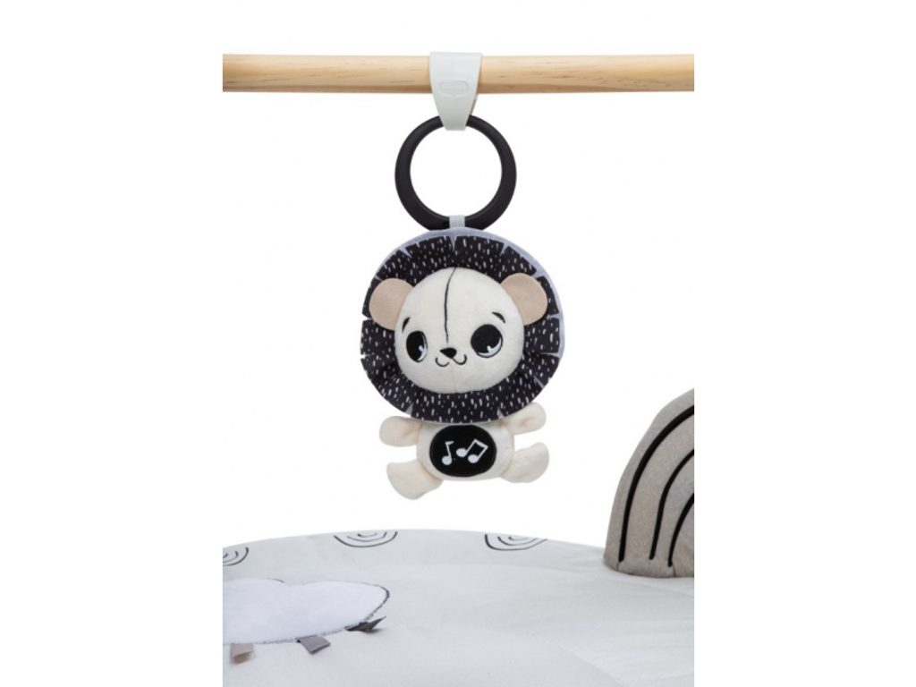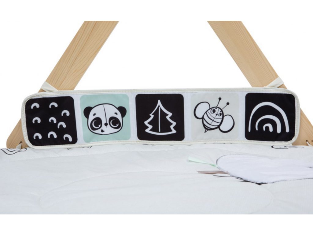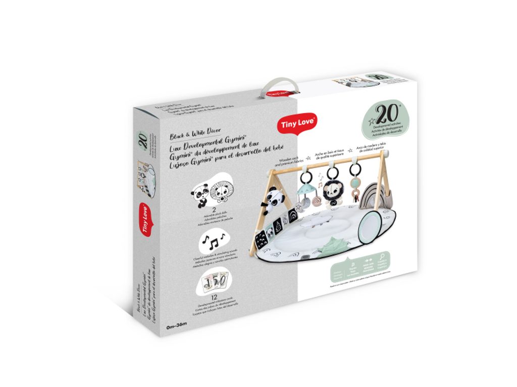 Hrací deka s hrazdou Tiny Love Black & White v luxusním provedení s dřevěnou hrazdou nabízí různorodé aktivity k zabavení a stimulaci smyslů dítěte od narození. Extra měkké polstrování a jemná tkanina zajistí dítěti na dece maximální pohodlí. Množství vývojových aktivit dítě zabaví a zároveň stimuluje jeho jednotlivé smysly. Hudební box v podobě lva hraje tři různé melodie a dítě si je aktivuje samo dotykem. Pozornost dítěte upoutá šplhající plyšová panda, dřevěné kroužky s chrastítkem a stužkami i závěsný kolotoč. Bezpečné zrcátko a textilní knížka ve tvaru leporela podněcují dítě ke hraní na bříšku. Chrasticí pultík reaguje na kopání nožičkami. Jednotlivé hračky je možné používat i samostatně mimo deku. Balení obsahuje 12 ilustrovaných karet s čísly 1-12, se kterými můžete každý měsíc vyfotit své miminko a dokumentovat tak jeho růst a vývoj během prvního roku života. Hrazdu je možné ve starším věku dítěte odstranit a deku dál používat jako hrací podložku. Rozměr: 90 x 90 x 46 cm Hrací deku je možné prát. Baterie 3xLR44 / AG13 (1,5V) jsou součástí. Vhodné pro děti od narození.