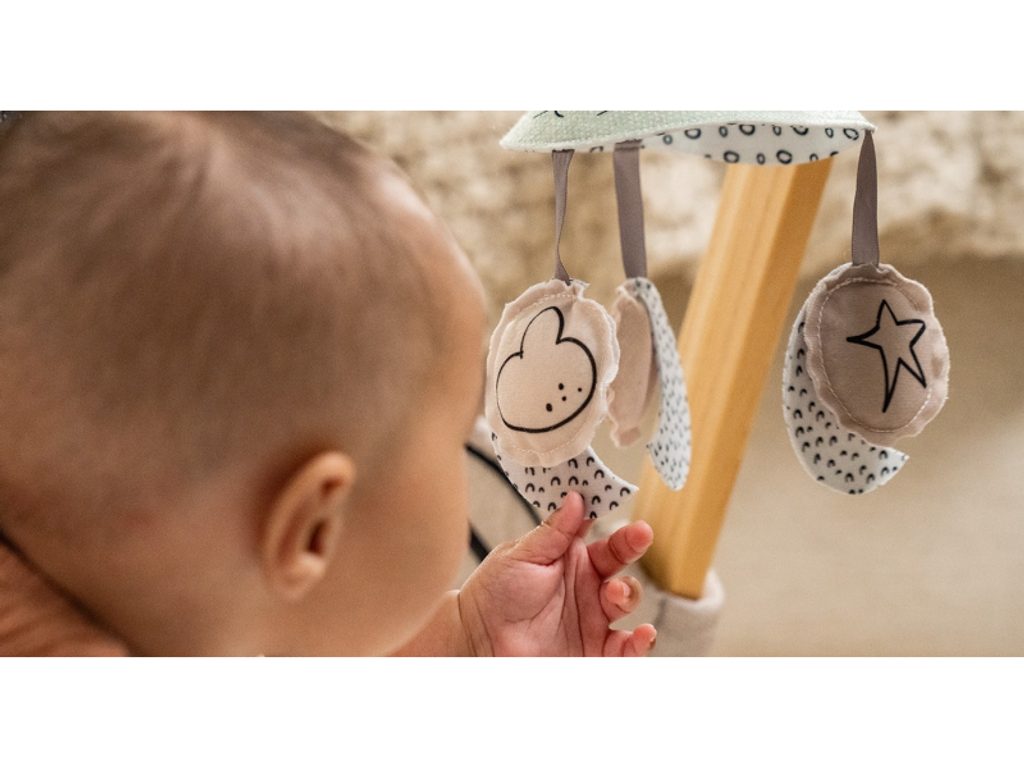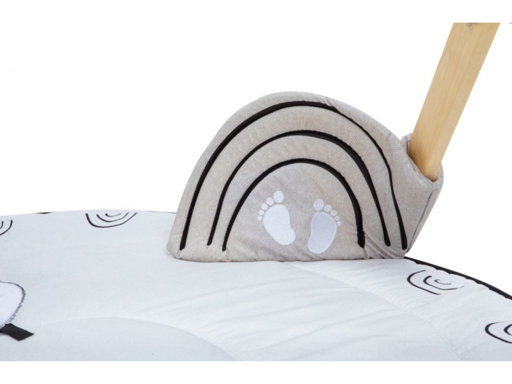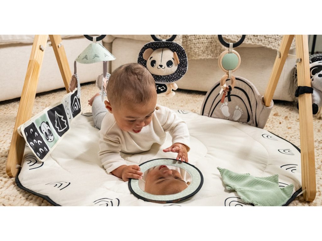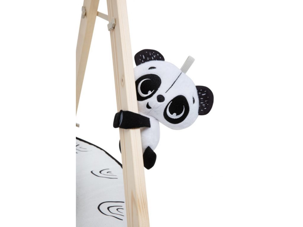 Hrací deka s hrazdou Tiny Love Black & White v luxusním provedení s dřevěnou hrazdou nabízí různorodé aktivity k zabavení a stimulaci smyslů dítěte od narození. Extra měkké polstrování a jemná tkanina zajistí dítěti na dece maximální pohodlí. Množství vývojových aktivit dítě zabaví a zároveň stimuluje jeho jednotlivé smysly. Hudební box v podobě lva hraje tři různé melodie a dítě si je aktivuje samo dotykem. Pozornost dítěte upoutá šplhající plyšová panda, dřevěné kroužky s chrastítkem a stužkami i závěsný kolotoč. Bezpečné zrcátko a textilní knížka ve tvaru leporela podněcují dítě ke hraní na bříšku. Chrasticí pultík reaguje na kopání nožičkami. Jednotlivé hračky je možné používat i samostatně mimo deku. Balení obsahuje 12 ilustrovaných karet s čísly 1-12, se kterými můžete každý měsíc vyfotit své miminko a dokumentovat tak jeho růst a vývoj během prvního roku života. Hrazdu je možné ve starším věku dítěte odstranit a deku dál používat jako hrací podložku. Rozměr: 90 x 90 x 46 cm Hrací deku je možné prát. Baterie 3xLR44 / AG13 (1,5V) jsou součástí. Vhodné pro děti od narození.