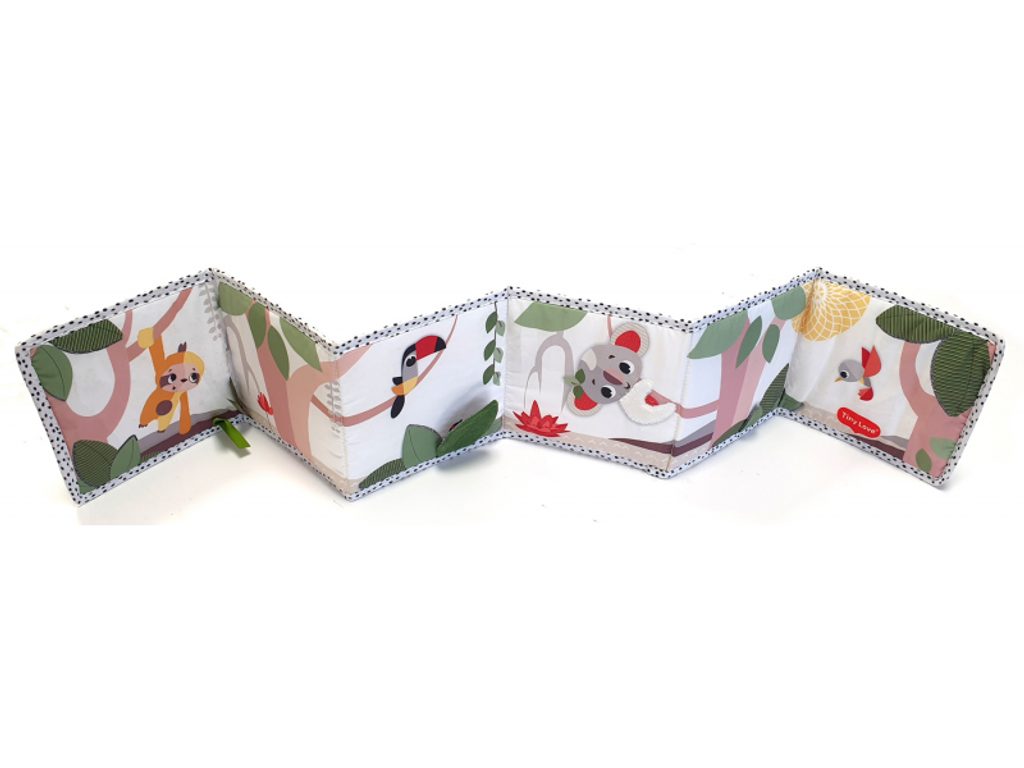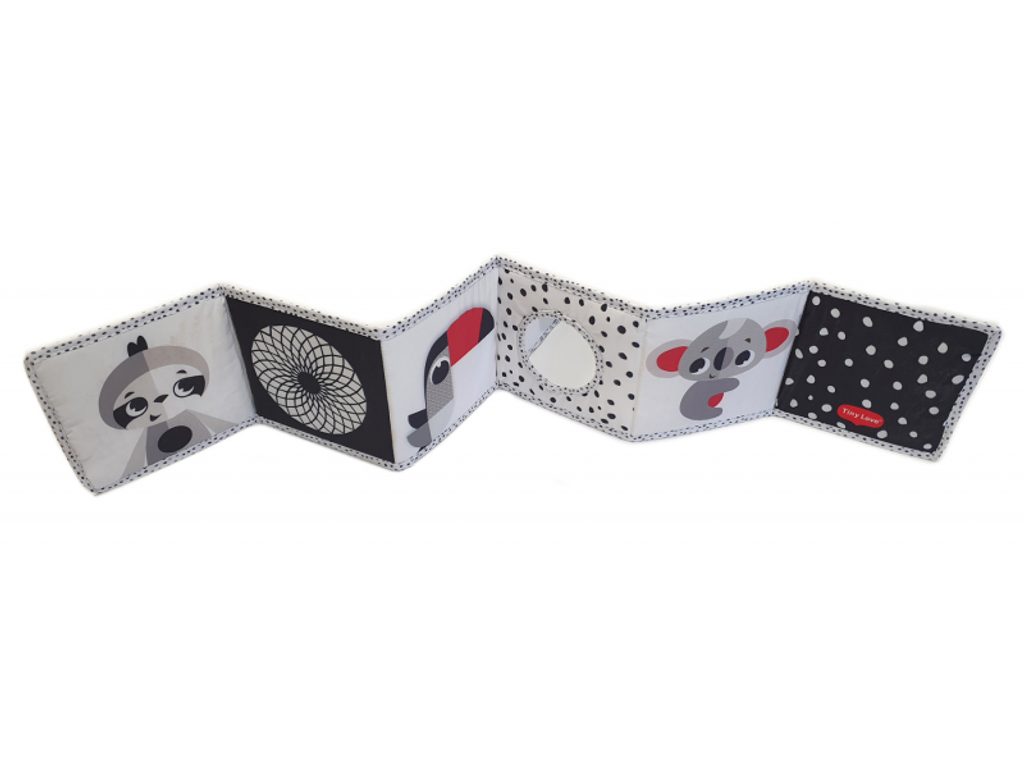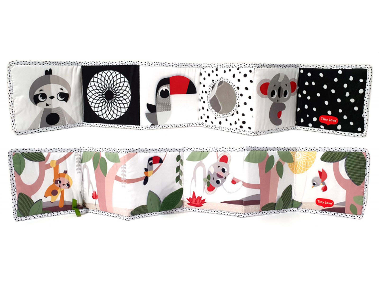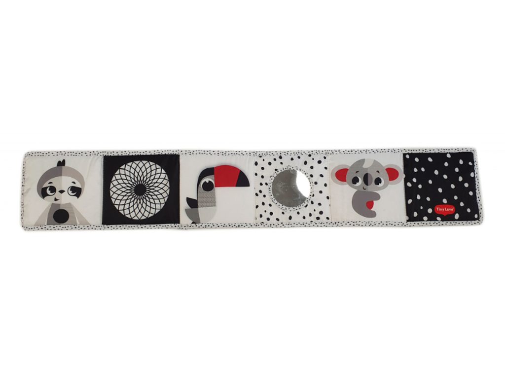 Oboustranná textilní knížka pro nejmenší Tiny Love je určena do kočárku, postýlky i na hrací deku. Kniha nabízí dvě strany pro dvě vývojová stádia dítěte: 0-3 měsíce: strana s bezpečným zrcátkem a vysoce kontrastními, jednoduchými obrázky v základních barvách, které podněcují rozvoj smyslů a emoční inteligence dítěte. Od 3 měsíců: strana s barevnými obrázky a různorodými texturami ke zkoumání, které podporují rozvoj smyslů a jemné motoriky dítěte. Knížka drží postavená samostatně pro hru na bříšku nebo je možné ji připevnit pomocí šňůrek na postýlku či do kočárku. Vhodné pro děti od narození.