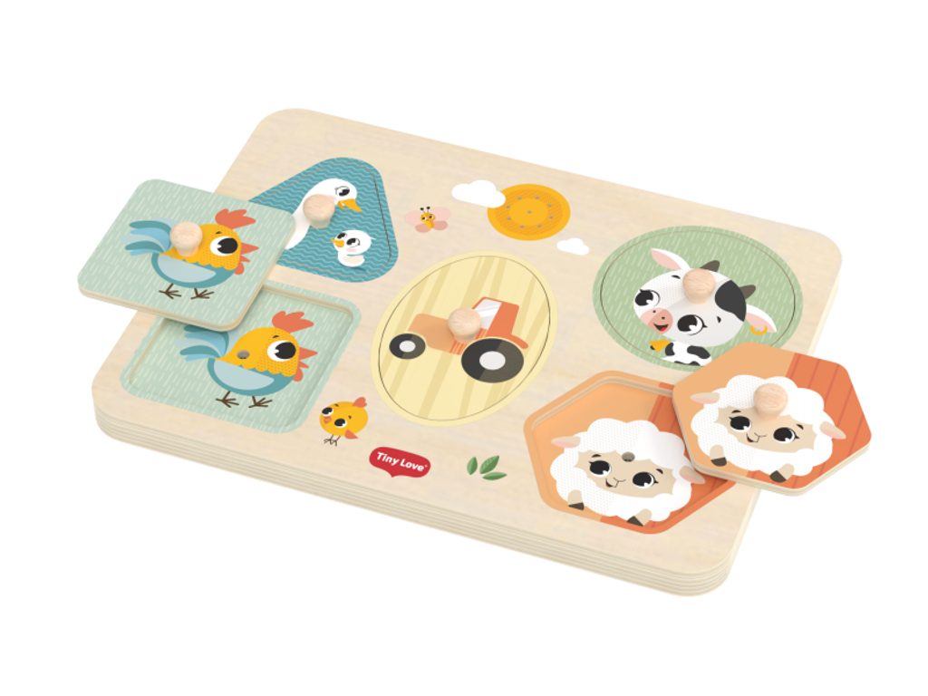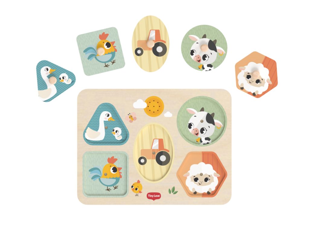 Pět velkých dílků s ilustracemi motivů ze života na farmě je opatřeno praktickými úchyty, takže je snadno uchopí i malé prstíky. Při hře dítě procvičuje rozpoznávání tvarů, barev a zvířátek, a zároveň rozvíjí jemnou motoriku a koordinaci ruka–oko. Každé vložení správného dílku je malým úspěchem, který posiluje sebedůvěru a chuť do hry.