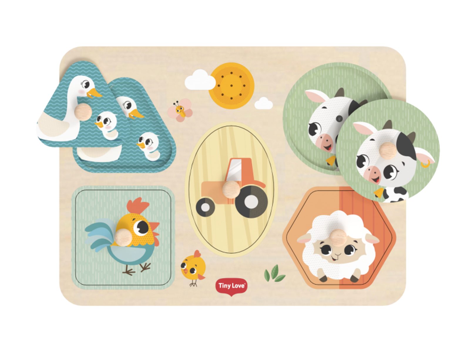 Dřevěné zvukové puzzle Tiny Love je hravá vkládačka pro nejmenší, která dítě okamžitě odmění za každý správně vložený dílek – zvukem zvířátka, které je na dílku namalované. Tahle malá dávka pochvaly přirozeně motivuje k dalšímu zkoumání a učí dítě základnímu principu příčiny a následku.