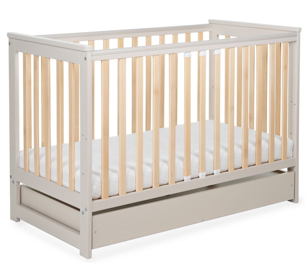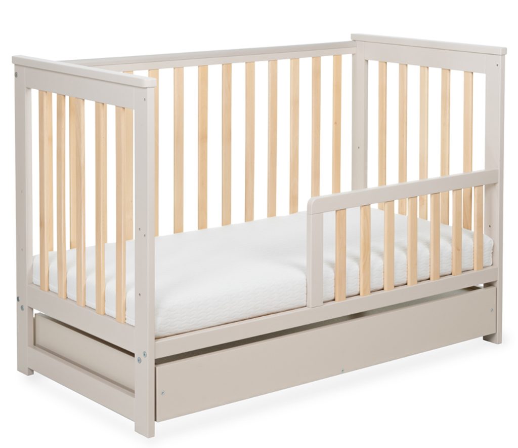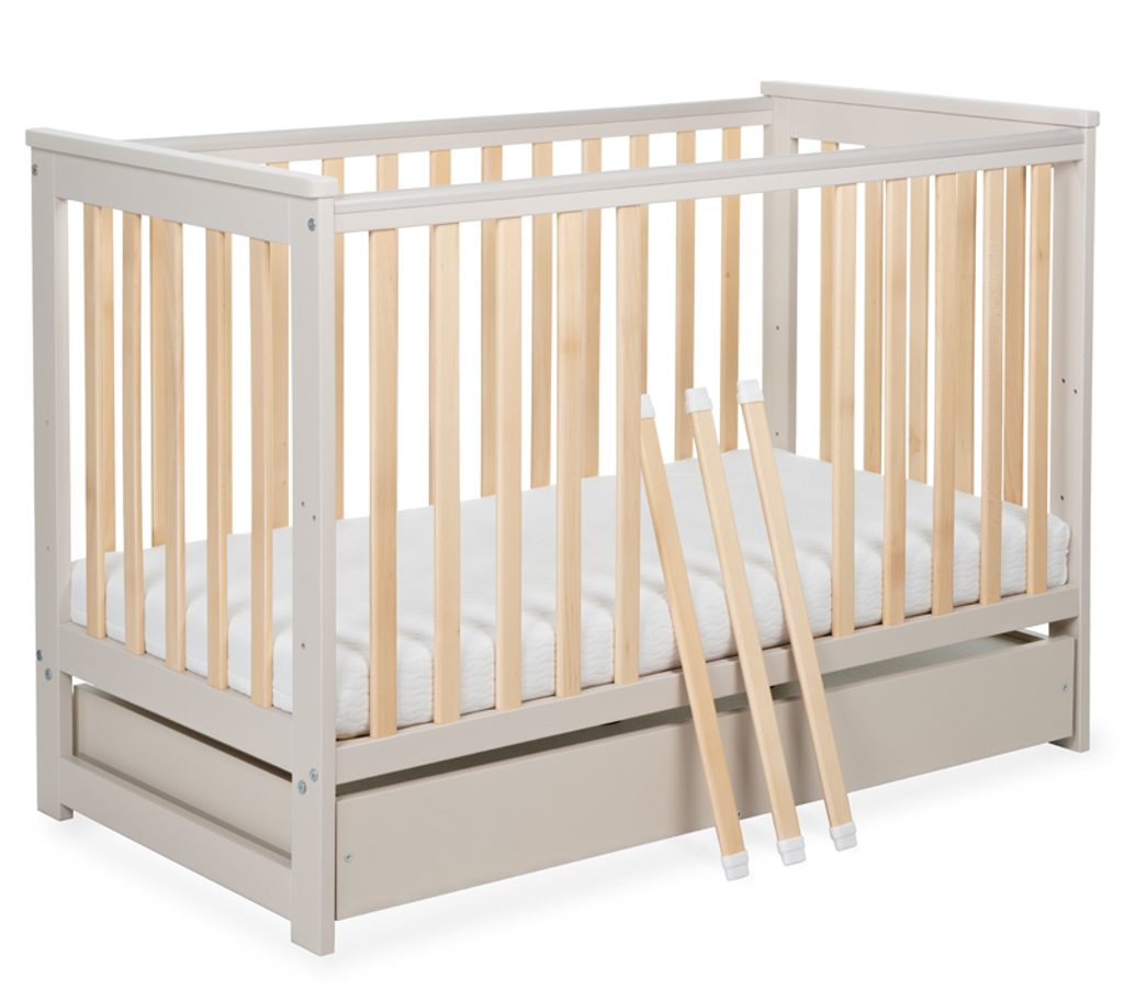 Tato novinka přichází s několika vylepšeními: má ploché tyčky, které jí dodávají moderní vzhled, a obsahuje zábranu, díky níž ji snadno přeměníte na válendu pro větší dítě. Stačí sundat jednu bočnici, nastavit rošt do nejnižší polohy a přidat zábranu, která zajistí pohodlný a bezpečný spánek i staršímu dítěti.