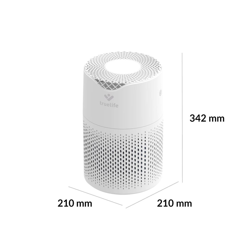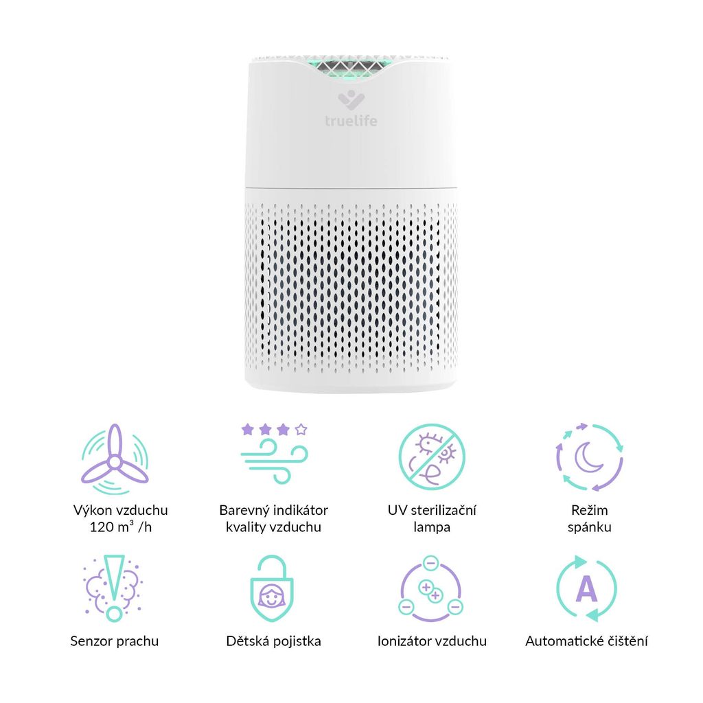 Čistička vzduchu TrueLife vyčistí až 120 m3 vzduchu za hodinu. Je vhodná do místnosti o velikosti 12-18 m2 a díky nízké hmotnosti jí můžete bez obav přenášet. Čistička celkově zlepšuje kvalitu vzduchu, ničí viry, bakterie a další nečistoty a může tak významně pomoci alergikům nebo astmatikům. Čistička je opatřena barevnými indikátory kvality vzduchu, funkcí automatické detekce nečistot a automatického čištění. Bydlíte-li na místě, kde se často práší, potěší vás přítomnost prachového senzoru. 6 násobná filtrace v podobě anti-bakteriálního filtru, HEPA filtru, uhlíkového filtru, katalytického filtru, UV světla a ionizace zachytí až 99,9% polétavého prachu a vyčistí 93,5 % těkavých organických látek. Zároveň zachycuje viry a koronaviry.