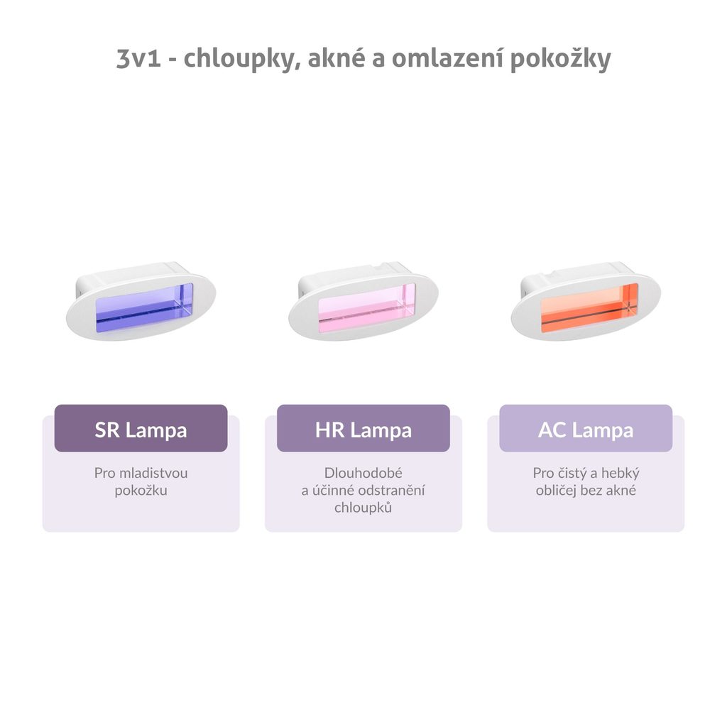 Epilátor TrueLife BELLE IPL E5 využijete kromě samotné epilace i k dalším aplikacím. Stačí pouze vyměnit lampu. K dlouhodobému a účinnému odstranění chloupků vám poslouží HR lampa, Nejednoho člověka trápí akné. Pokud chce mít obličej čistý a hebký na dotek, doporučujeme použít AC lampu. Pokud chcete svoji pokožku omladit, pomůže vám s tím SR lampa. Všechny lampy jsou součástí balení. Nemusíte si tedy nic dokupovat. Určitě oceníte i praktický stojánek.