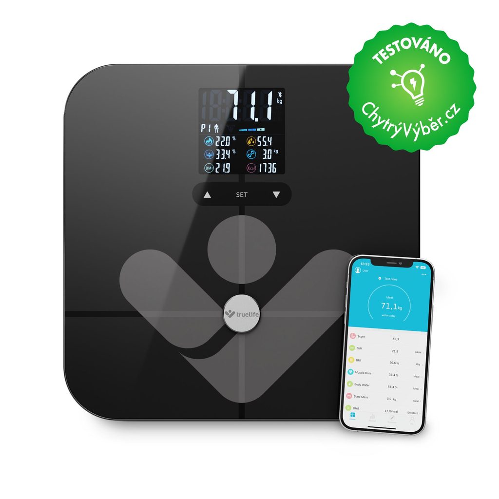 Svůj zdravý životní styl nejlépe podpoříte, budete-li dokonale rozumět svému tělu. Pomoci vám v tom může inteligentní váha TrueLife FitScale W7 BT. Kromě zjištění hmotnosti, provede také diagnostiku pomocí bioelektrické impedanční analýzy a vypočítá 19 měřitelných indexů, z toho 7 i bez použití aplikace. Své výsledky vidí uživatel na přehledném barevném LCD displeji. Váhu lze propojit prostřednictvím Bluetooth s mobilním telefonem a stažením aplikace získáte ještě detailnější přehled o tom, co se s vaším tělem děje. Váha je vyrobena z tvrzeného ITO skla, které je velmi odolné a má nosnost až 180 kg. Zaměřte se na své zdraví komplexně, pouhá hmotnost není tím hlavním ukazatelem.