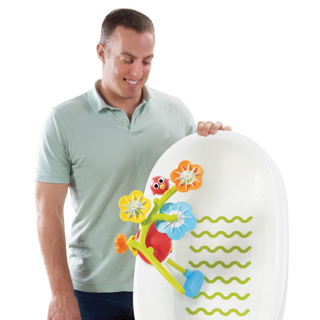 Stiskněte oranžového ptáčka pro aktivaci proudu vody a vodních efektů na květinách. Bočním tlačítkem ovládejte průtok vody a rychlost otáčení květin. Otočte stonek s ptáčkem a jemně postříkejte dítě. Začněte na nožičkách. Když je dítě spokojené otočte stonek a ptáčka, abyste postřikovali vodou i zbytek jeho těla.