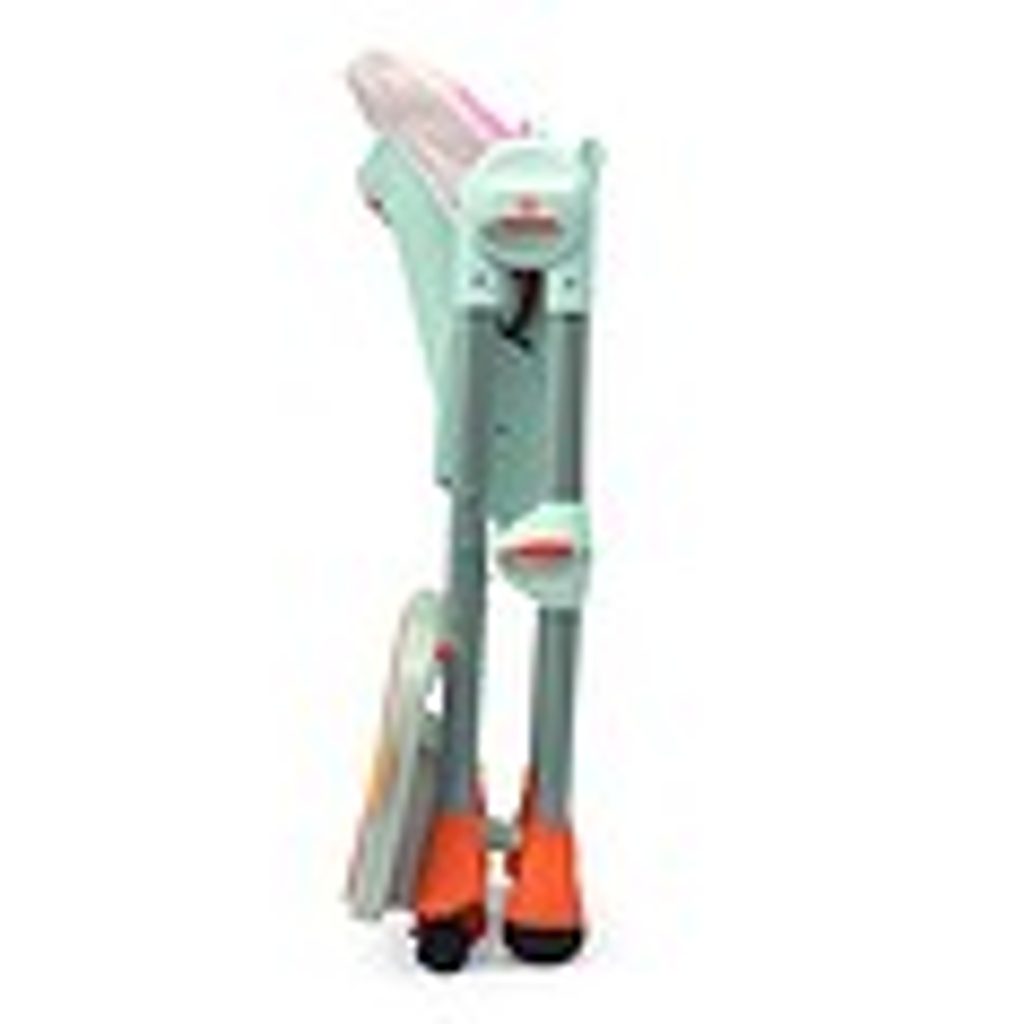 Když je židle složena, stojí samostatně bez opory a zabere tak velmi málo místa. Tác může být po odejmutí připevněn na zadní stranu židličky.