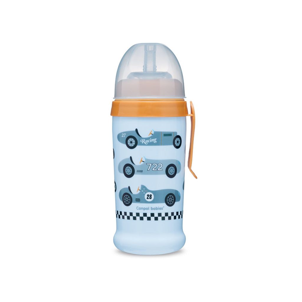 Praktická barevná láhev se silikonovou nevylévací slámkou je určena pro děti starší 12-ti měsíců, které již umí samy pít. Ideální na cestování nebo procházky. Objem 350 ml. Láhev neobsahuje BPA.