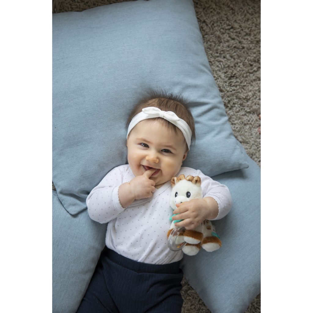 - Chrastítko s korálky: Jakmile dítě plyšákem zatřese, ozve se zábavné chrastění korálků! Žirafka má kolem krku šálu s vyšíváním a na těle tři různobarevné textilní pásky, které pomáhají jasně identifikovat produktovou řadu, do které tato roztomilá plyšová žirafka patří.