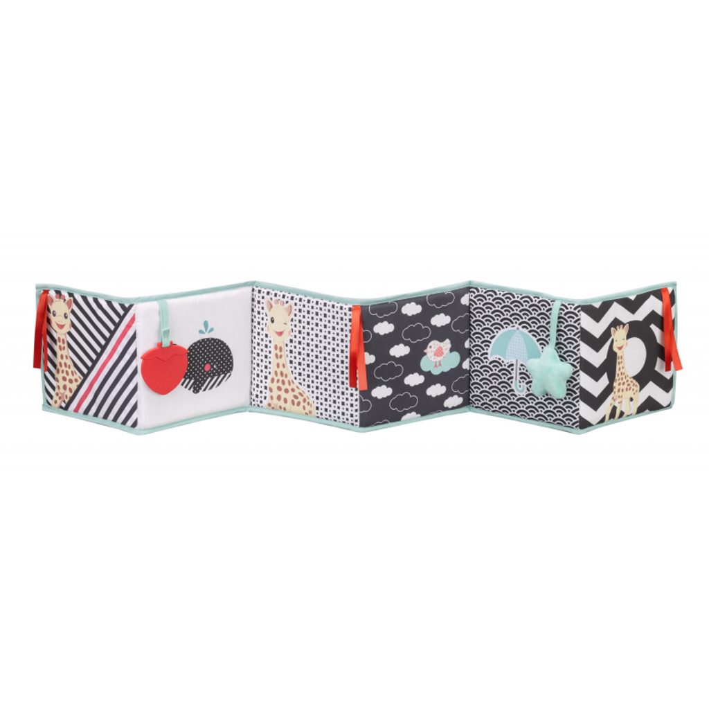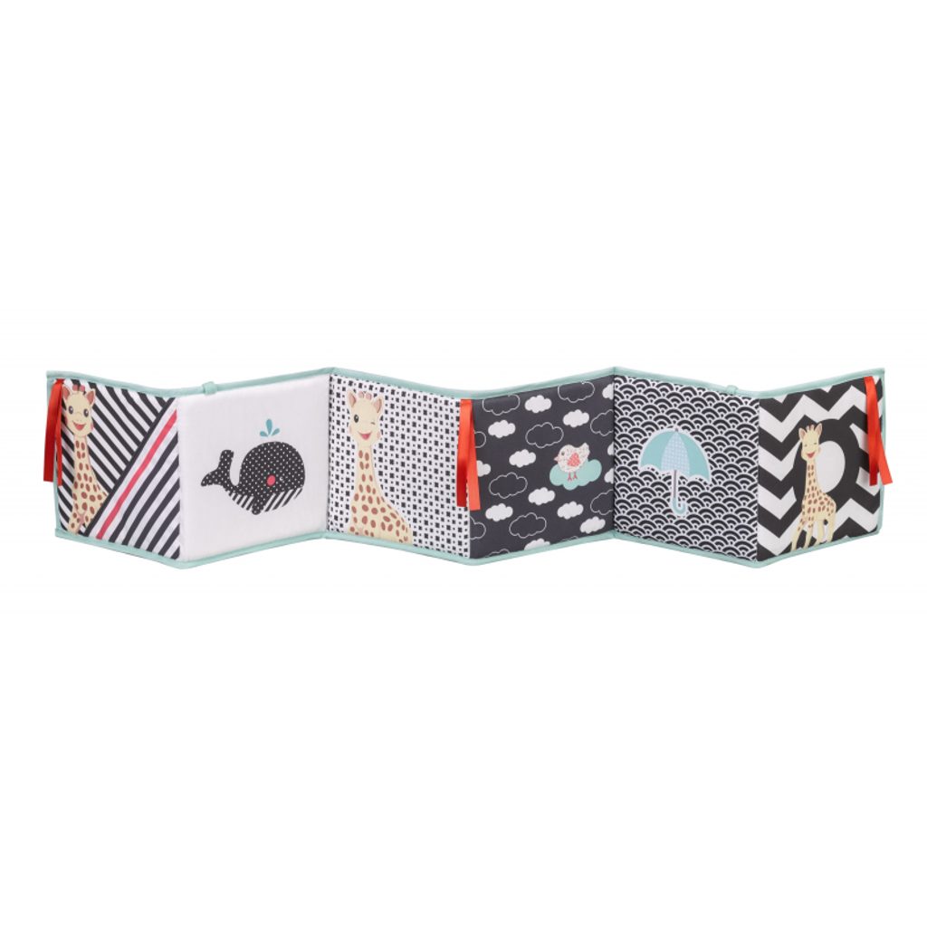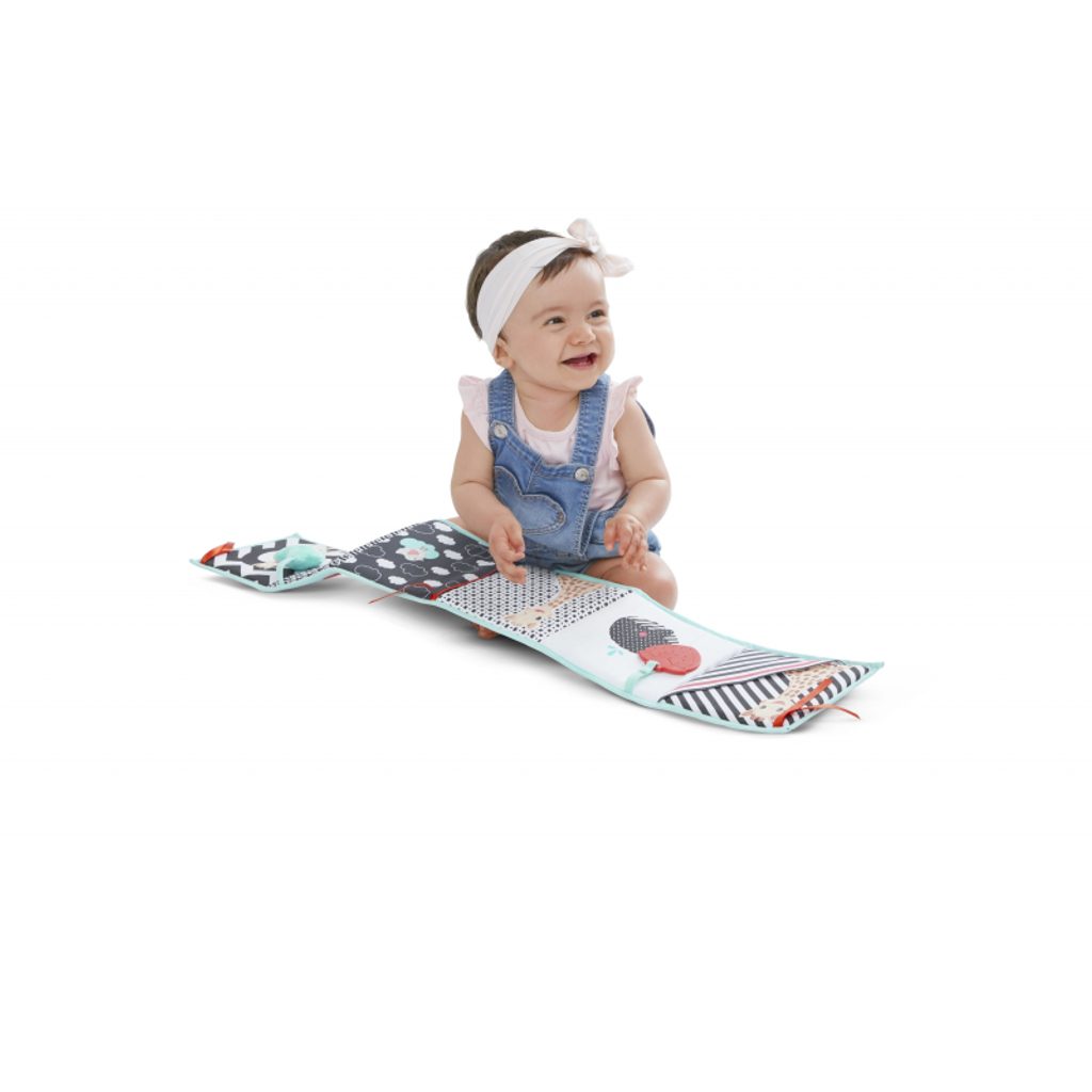 Chytré – tuto knížku můžete položit na zem nebo díky 6 textilním páskům zavěsit k postýlce nebo k hrací ohrádce.