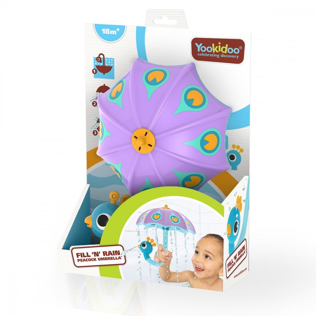 Po ponoření do vody se deštník naplní vodou a vytvoří bubliny. Po zvednutí vytvoří deštník jemný déšť a ze zobáku páva stříká voda. Pro více zábavy roztočte deštníkem a sledujte, jak voda stříká kolem dokola.