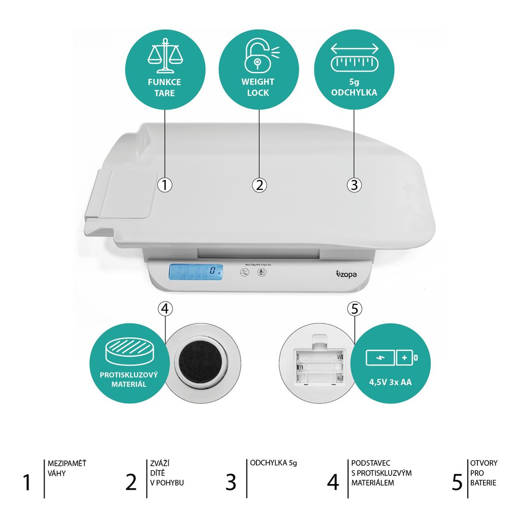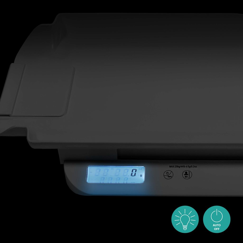 Vysoce přesná elektronická váha vám umožní pozorně sledovat vývoj vašeho miminka od jeho narození po první krůčky. Váha zachytí již 0,02 kg, vrchní hranice je 20 kg.