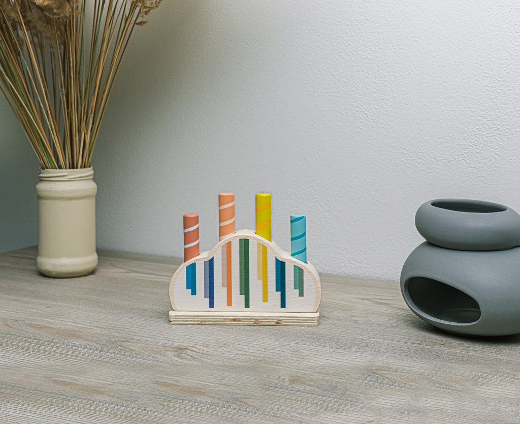 Zabavte dítě na dlouhé hodiny s vyskakovací dřevěnou hračkou. Tři barevné kolíky v designu měsíce a hvězd jsou upevněné v dřevěném podstavci s pružinami. Když se tyto kolíky jemně stisknou, uvolní se a pružina je nechá vyskočit ven. Hračka rozvíjí motoriku, koordinaci a soustředění a je tak ideální pro rané učení.