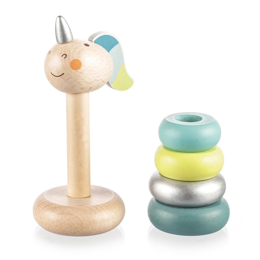 Dřevěné nasazovací kroužky ve tvaru jednorožce pro děti od 16 měsíců.