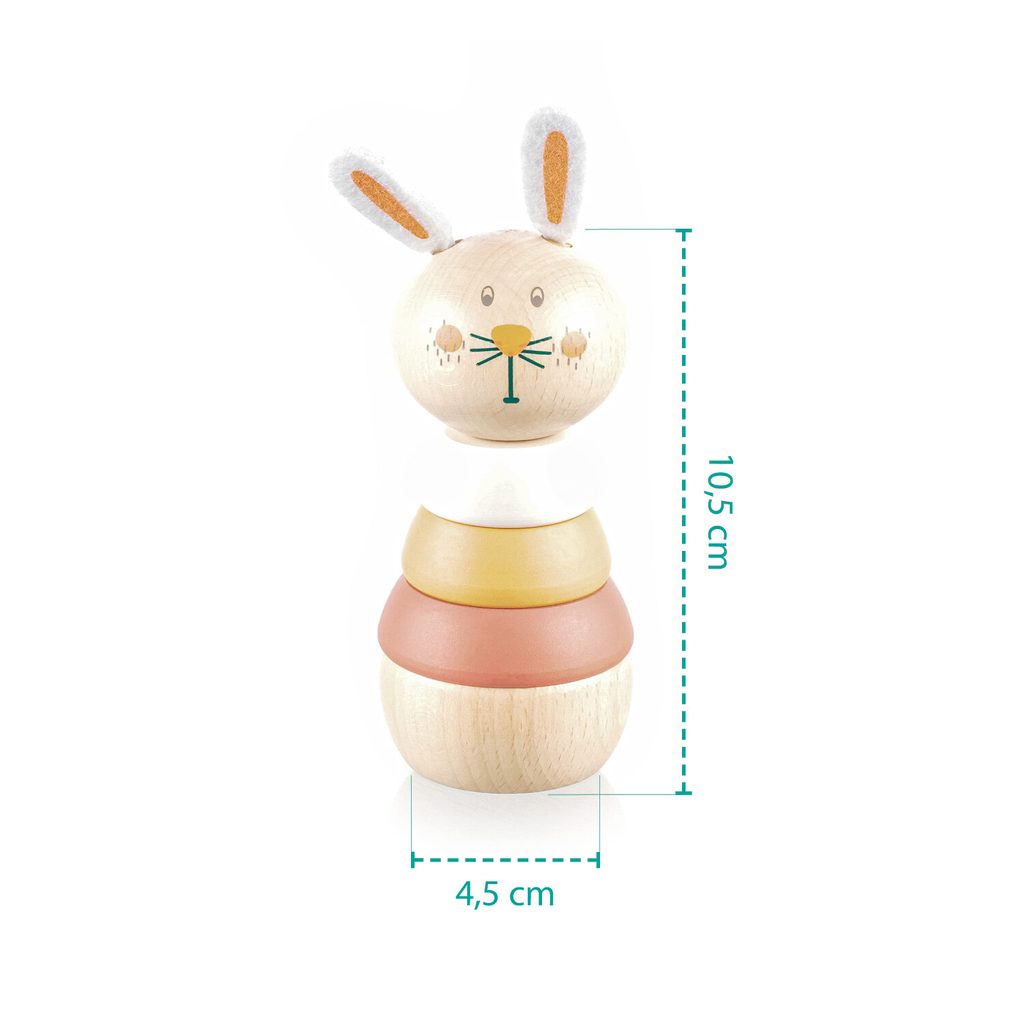 Zabavte dítě na dlouhé hodiny! Nasazovací hračka králík je sada vyrobená z dřevěných kousků, které se rozloží a opětovně nasazují. Roztomilý design králíčka dítě zaujme a pomůže mu hravou formou rozvíjet motoriku a prostorové myšlení.