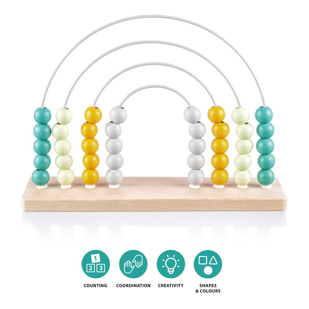 Je vyrobeno z barevných kovových oblouků a odolného dřevěného podstavce. Pestrobarevné korálky lze po obloucích libovolně přesouvat. Počítadlo rozvíjí smysly a koordinace, kromě toho pomůže dítěti se zlepšit v identifikaci barev.