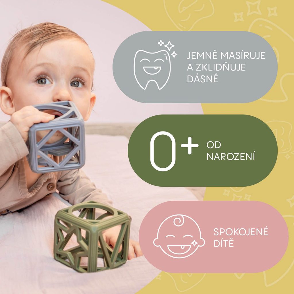 Pomozte svému miminku překonat náročné období prořezávání zoubků se silikonovým kousátkem Square. Jeho jedinečný geometrický tvar skvěle padne do malých ručiček a nabízí účinnou masáž dásní, která zmírňuje nepříjemné pocity při prořezávání zoubků.
