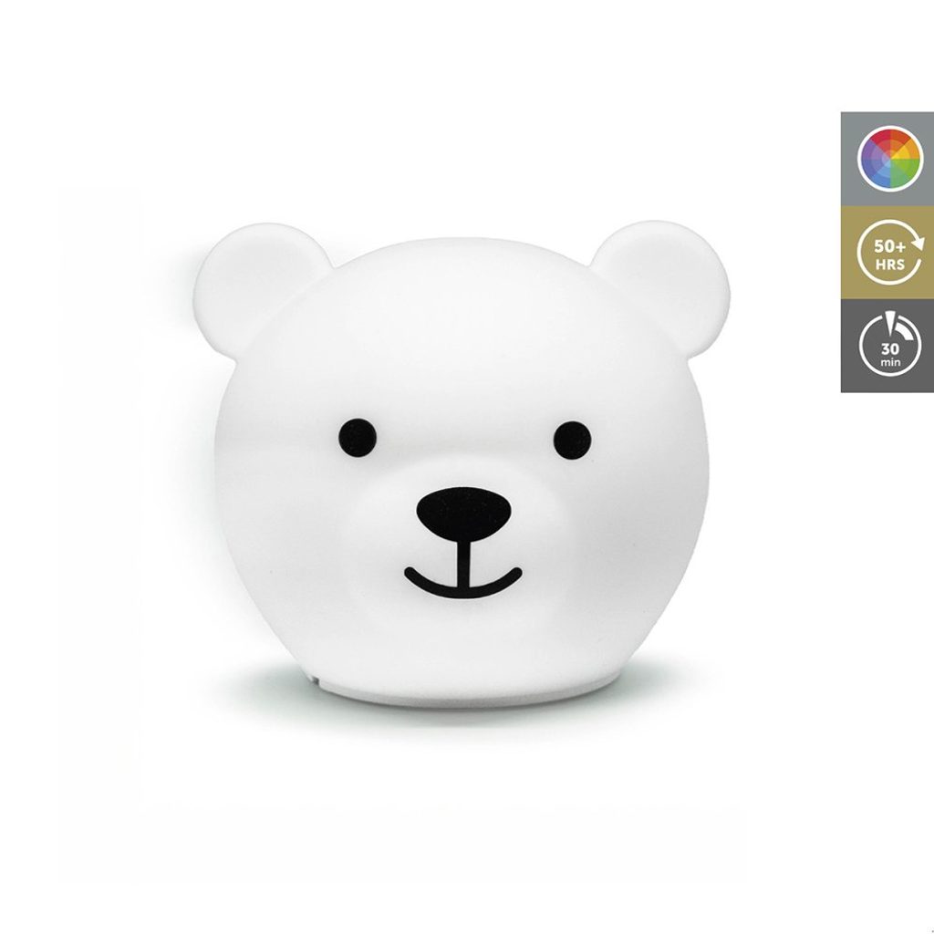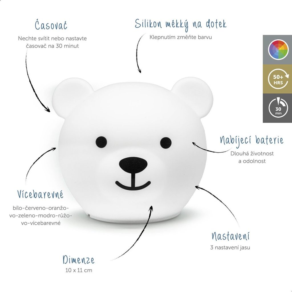 Pouhým poklepem na medvíka je možné měnit barvu nočního světla. Můžete si vybrat červené, oranžové, žluté, zelené, modré, růžové, bílé a vícebarevné světlo.