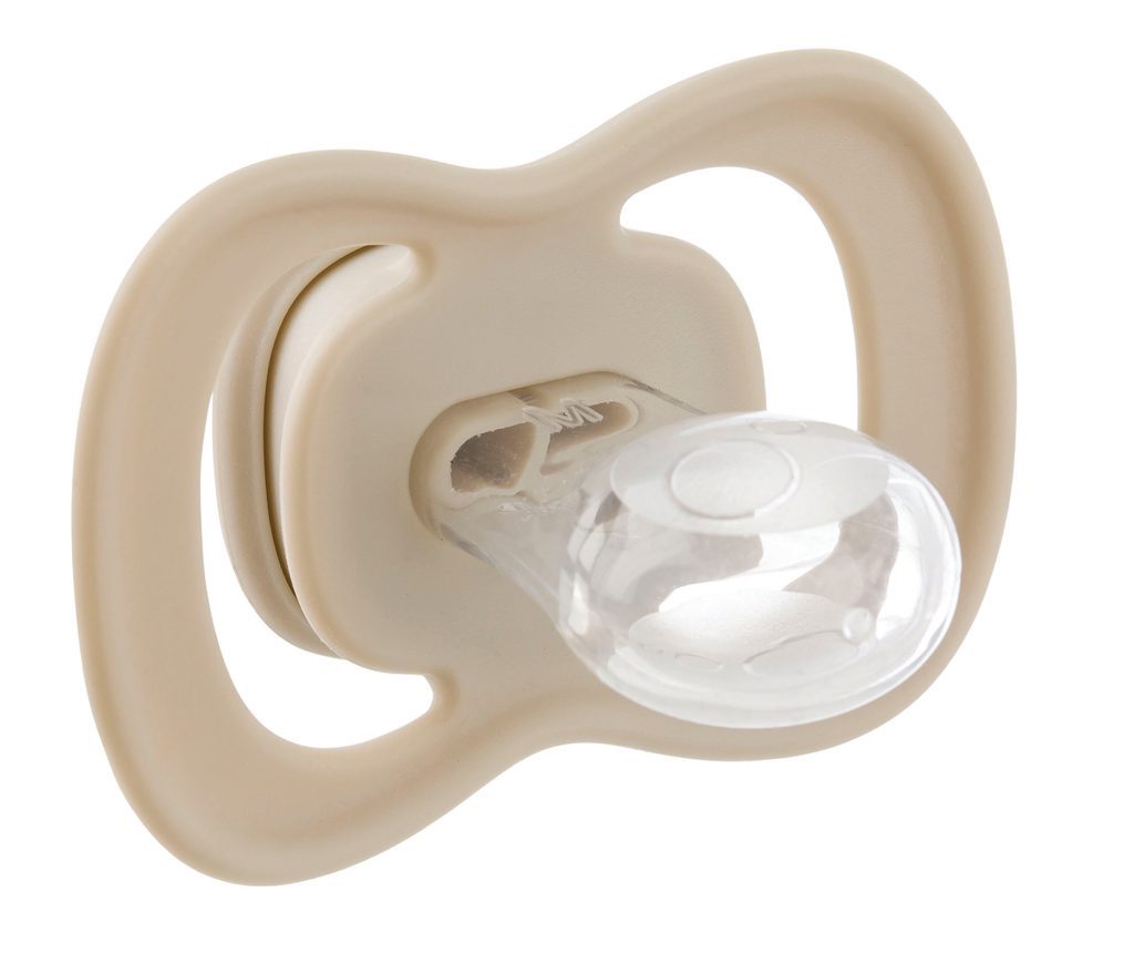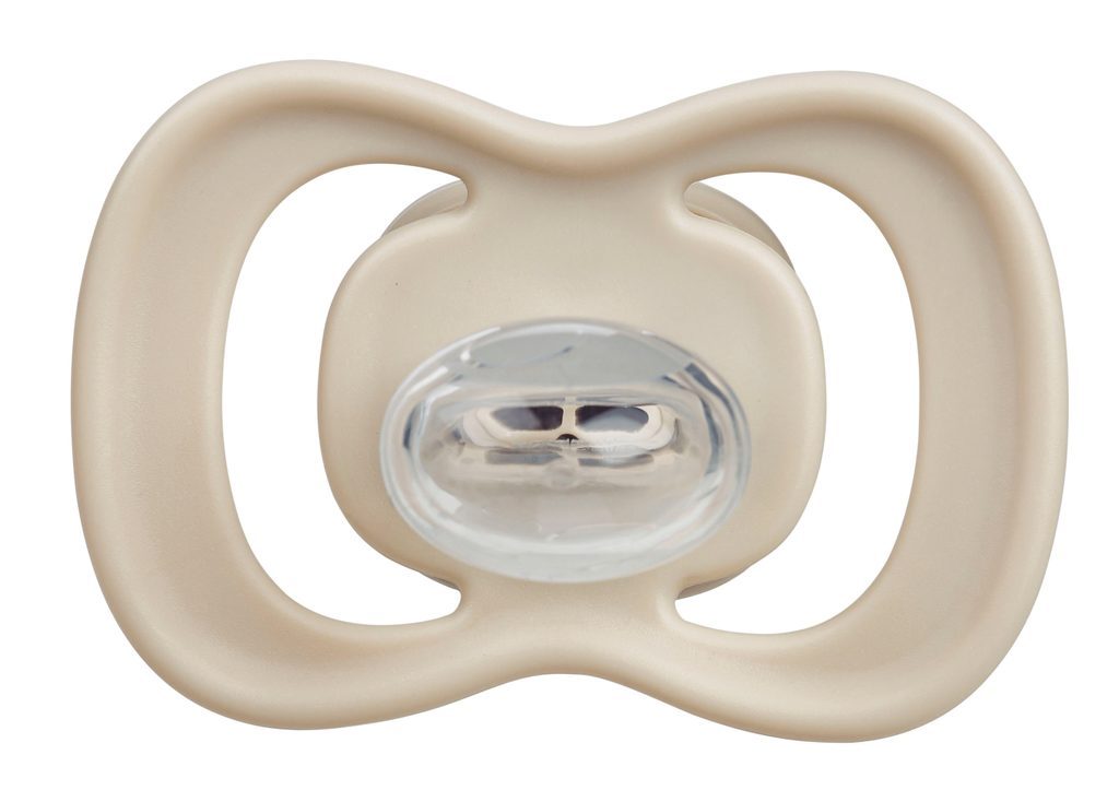 Vnější symetrická barevná část dudlíku s větracími průduchy (štít) obsahuje antimikrobiální přísadu na bázi stříbra, která eliminuje až 99,9% bakterií. Terčík s větracími průduchy zakrývá menší část kůže kolem pusinky dítěte a zmenšuje se tak riziko vzniku nechtěného ekzému pod terčíkem dudlíku. Symetrické tvarování barevného štítu zajišťuje optimální průchodnost vzduchu pod nosem dítěte.