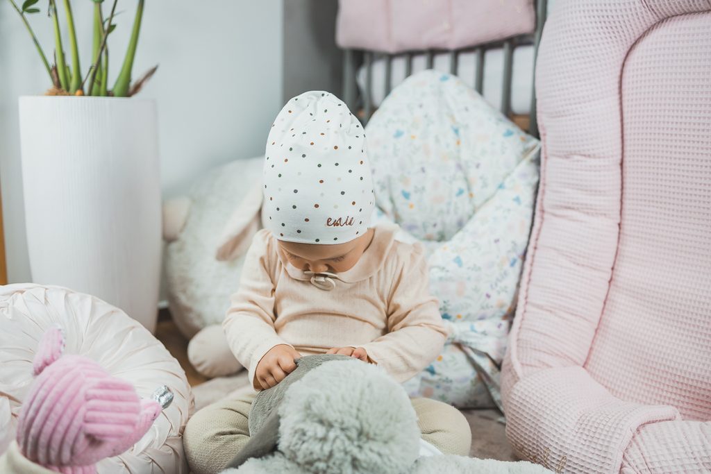 Dětská čepice ve velikosti pro miminka od 3-6 měsíců, obvod hlavy 32 - 36 cm. Velmi jemná a příjemná čepička. Čepice je vyrobena z bavlněného jersey, které obsahuje… Zobrazit více