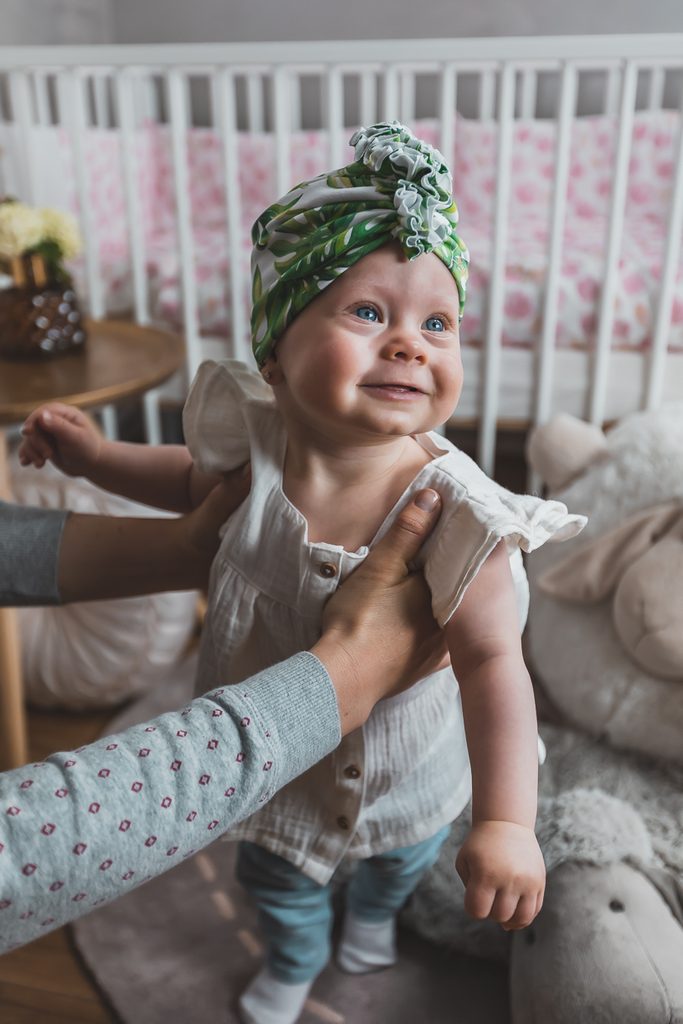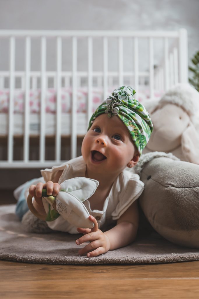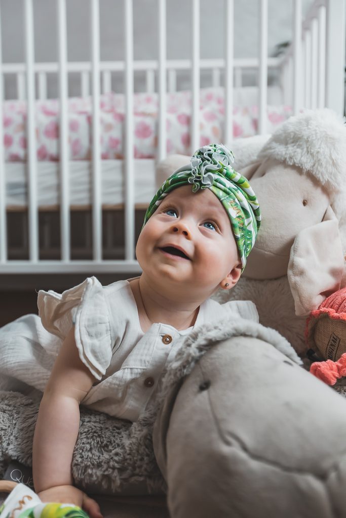 Dětský turban s ozdobnou přední částí ve velikosti pro miminka od 3-6 měsíců.